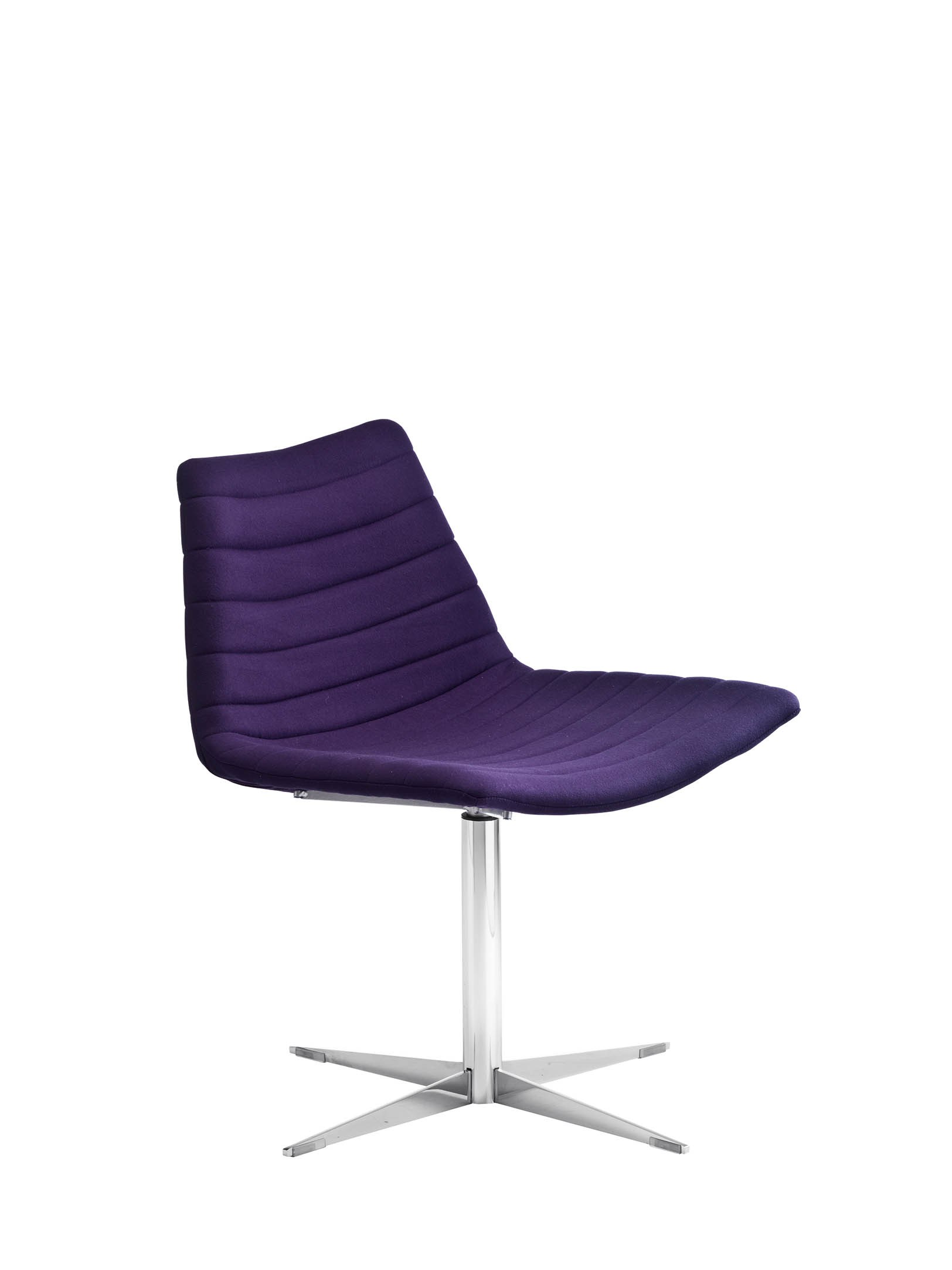 Swivel lounge chair with wooden structure, chrome or painted steel. Upholstered shell.