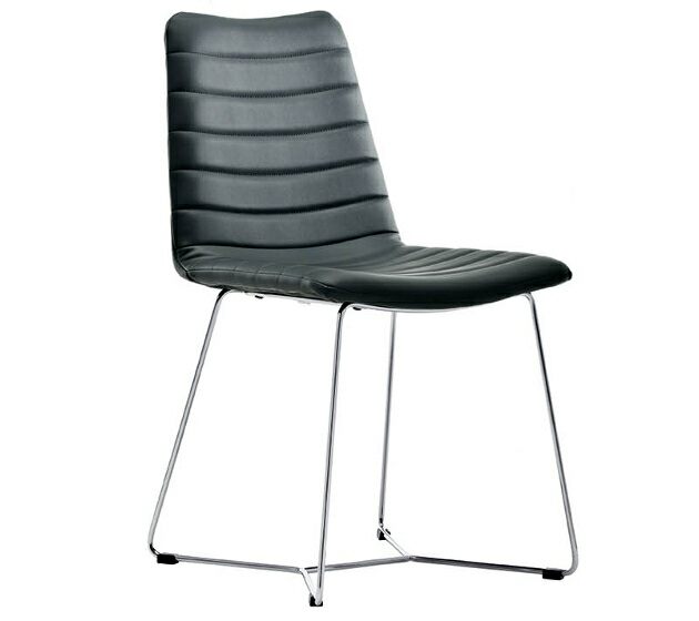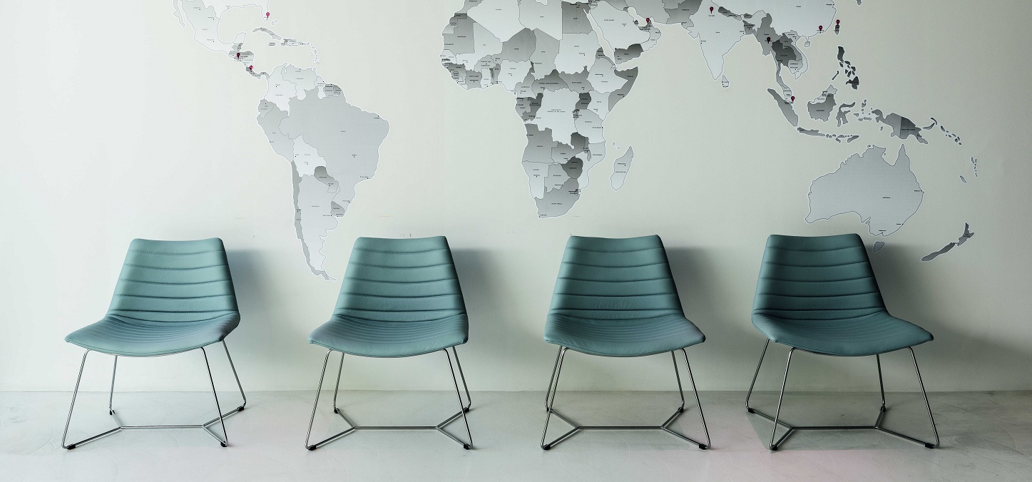 Chair, armchair, stool, fix or swivel lounge chair with wooden structure, chrome or painted steel. Upholstered shell.