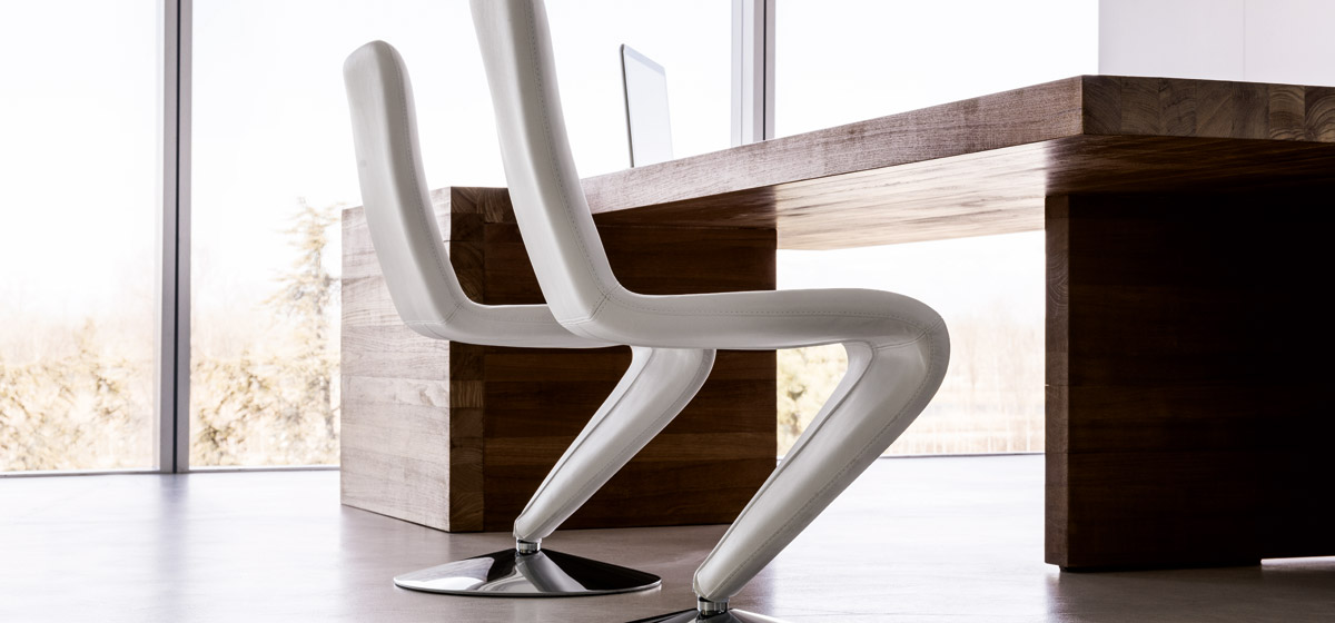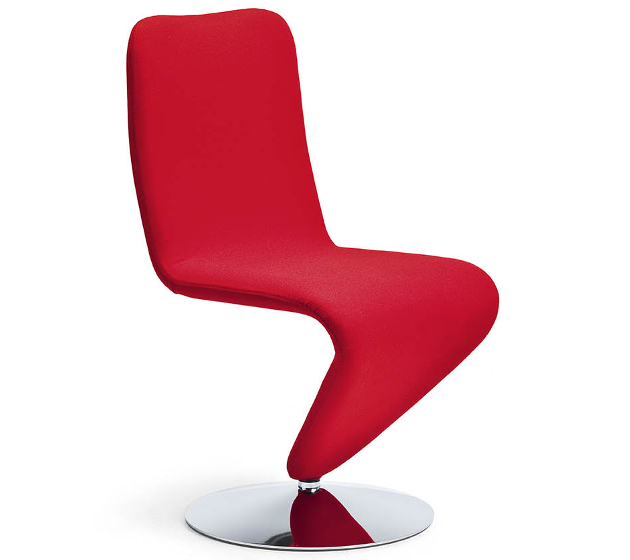 Swivel armchair with round base in chrome, seat upholstered in leather, ecoleather, fabric or custom’s fabric.
