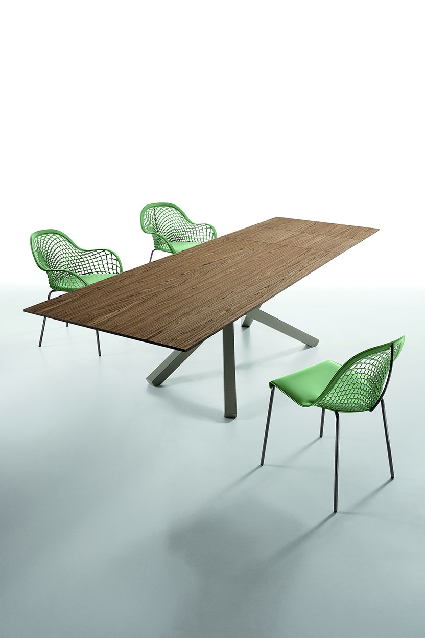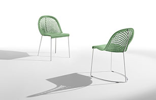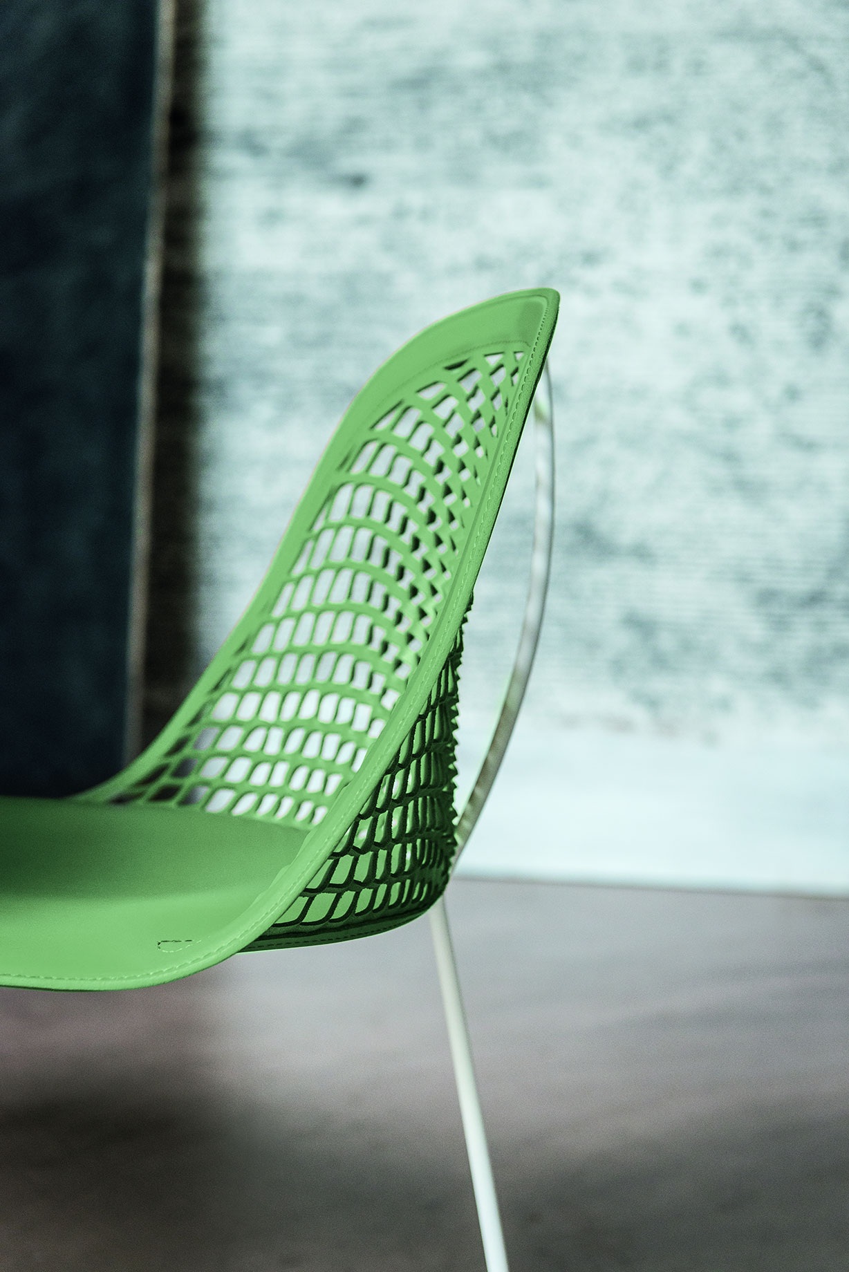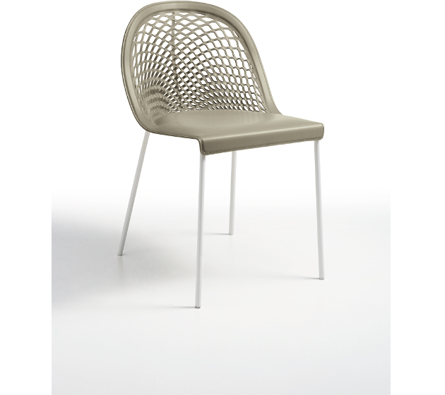Chair with four leg structure available in white painted, chrome or black nickel. Seat and backrest in hide..