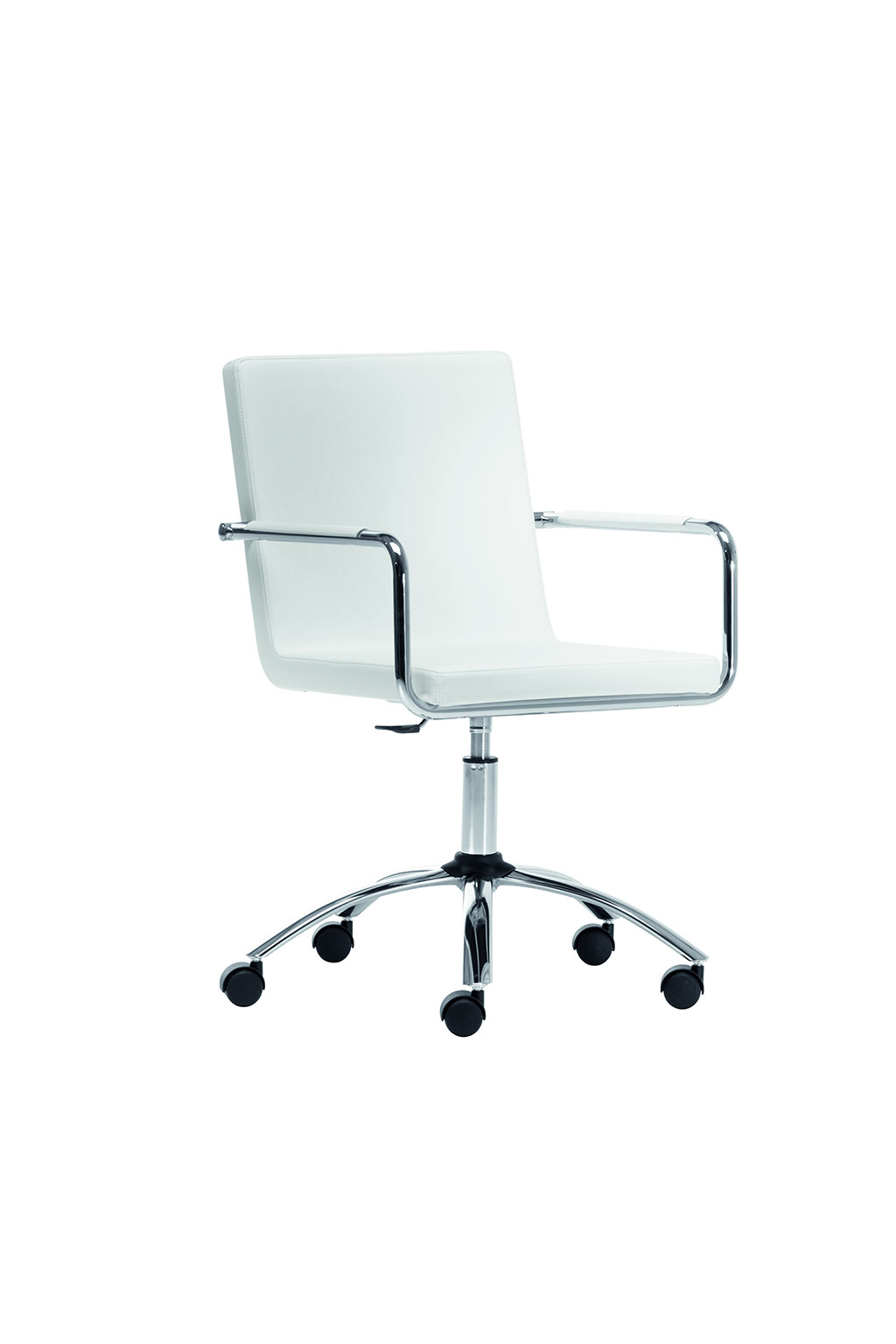 Armchair with 5 ways base and armrests in chrome. Shell upholstered in leather, ecoleather, fabric or custom fabric. Height adjust from 89cm to 98 cm; Seat Height adjusts from 48cm to 57cm.