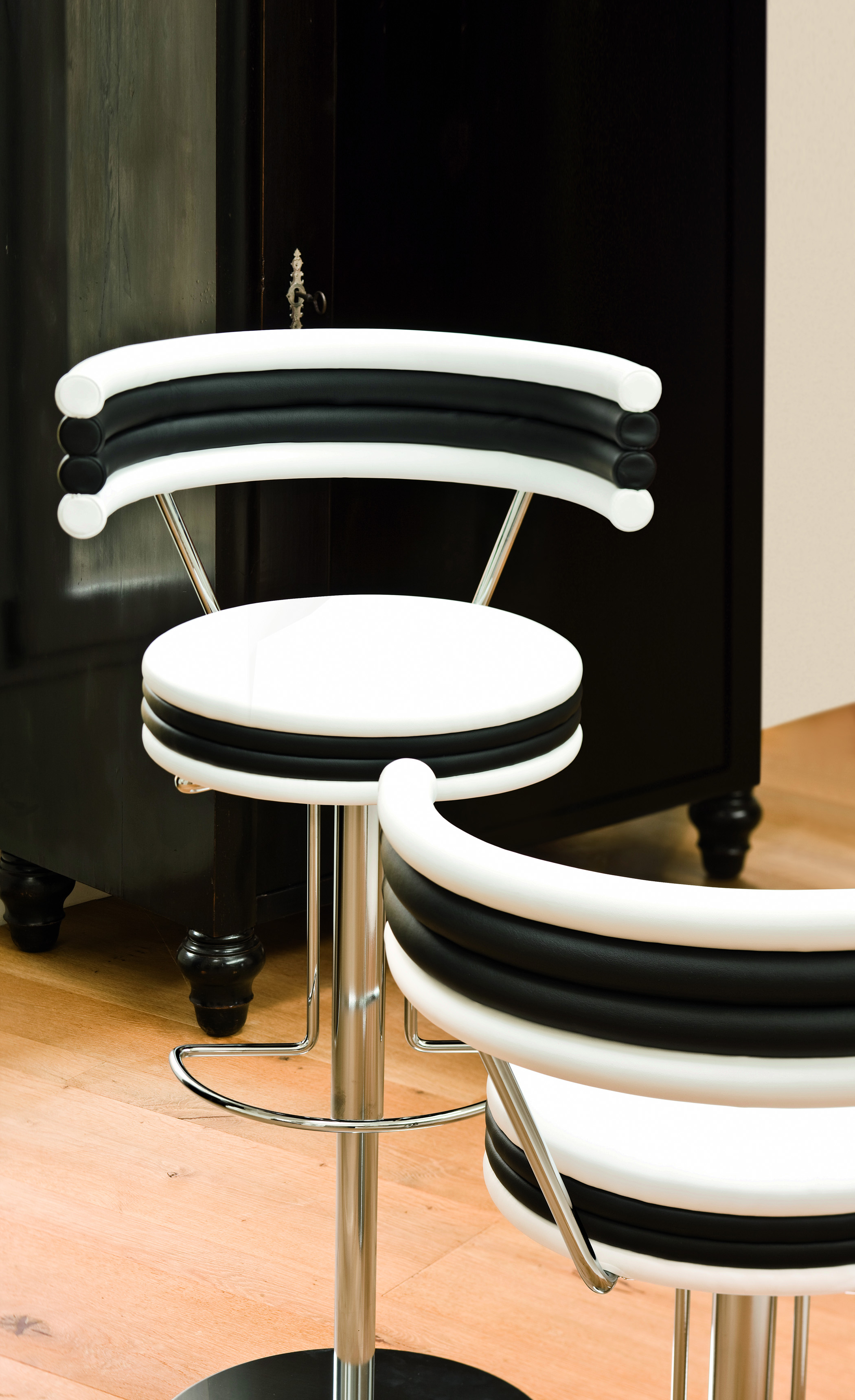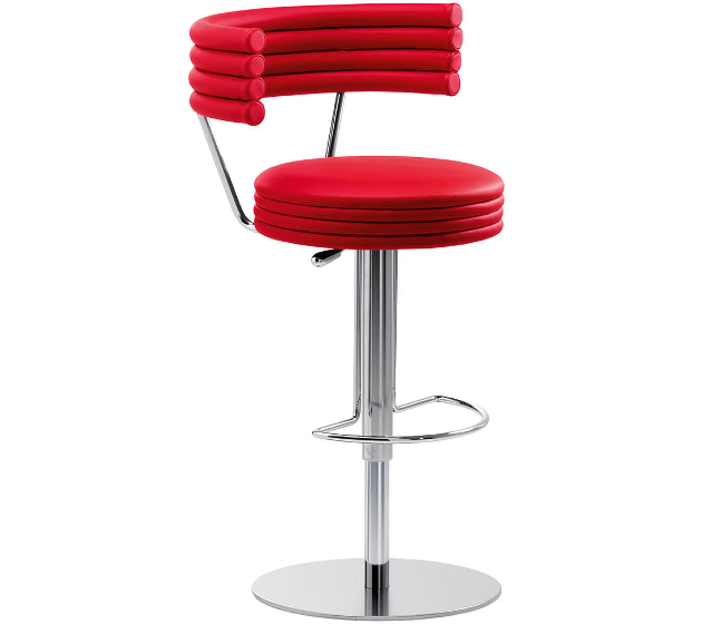 Swivel and height adjustable stool with round base in satin steel. Chrome frame, seat and backrest upholstered in leather, ecoleather, fabric or custom fabric. Chrome footrest. Height adjusts from 87cm to 112cm; Seat Height adjusts from 58cm to 82 cm.