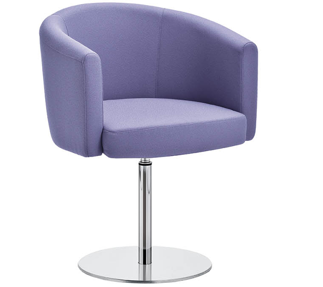 Swivel armchair with round flat base in satin steel. Shell upholstered in leather, ecoleather, fabric or custom fabric.