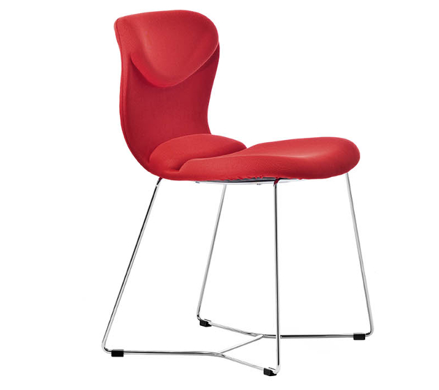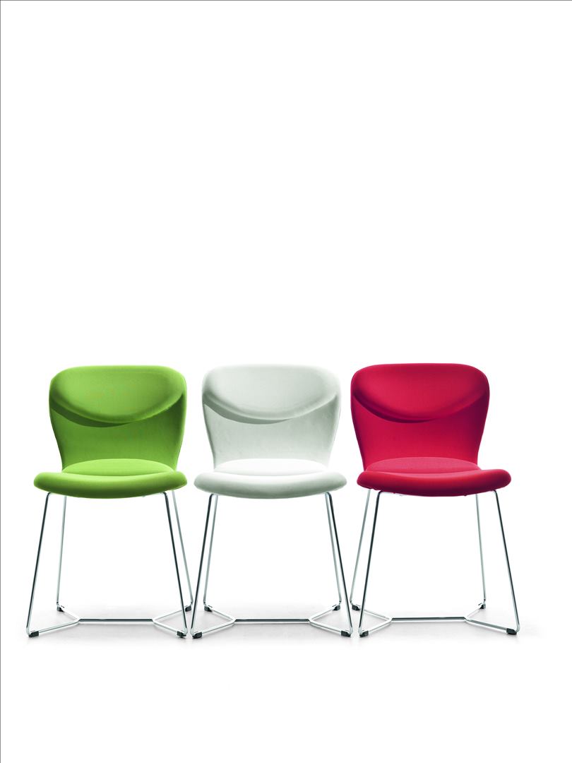 Chair with sled base available in chrome, white or ash grey steel painted. Seat upholstered in leather, ecoleather, fabric or custom’s fabric.