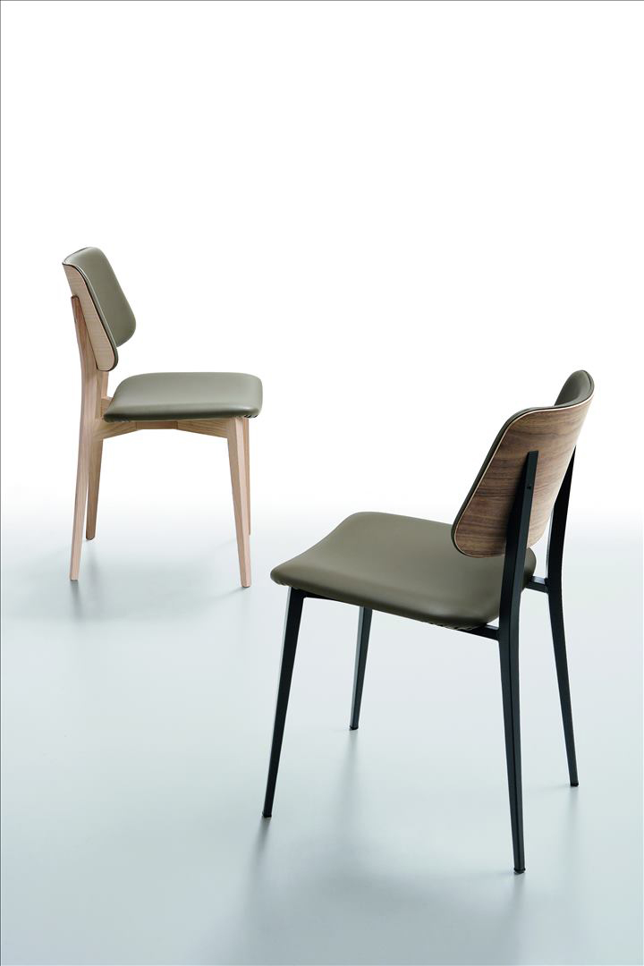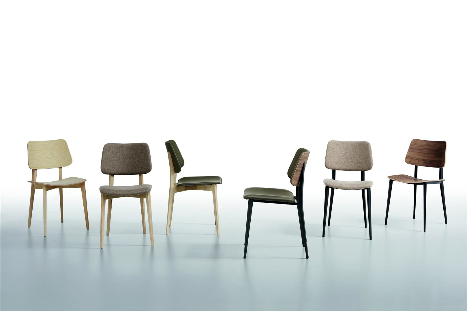 Joe is a young chair reminiscent of the ’70s, reinterpreted in a modern key. The warmth of wood and fabrics clashes with the freshness of steel and leathers creating infinite combinations of style. Joe with its compact shape is suitable for home and contract. Chair with four leg frame available in different finishes: dark oak, light oak or walnut. Seat and backrest upholstered with leather, ecoleather, fabric or custom’s fabric. Available version with backrests front face upholstered and wooden back in the same finish as the frame.
