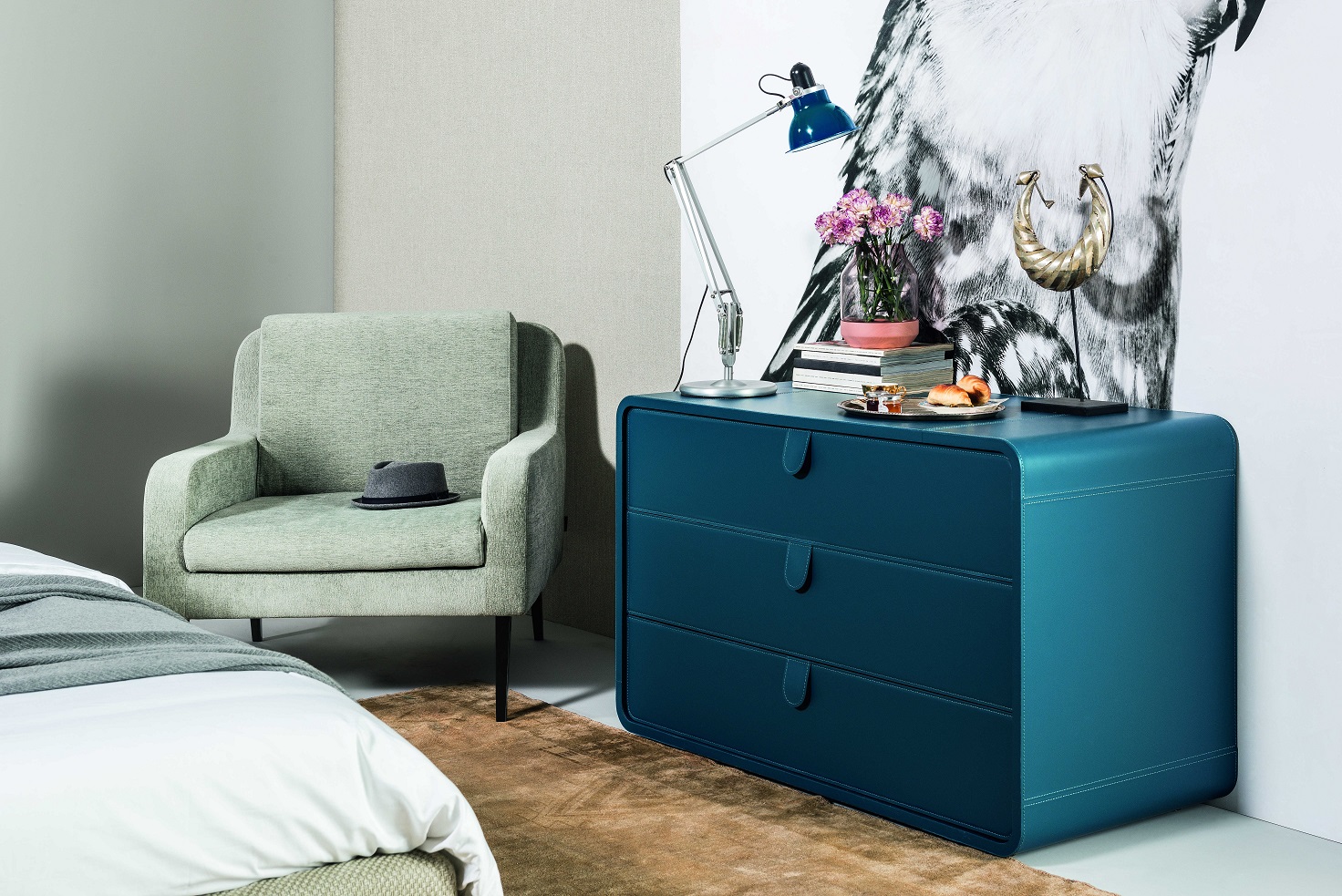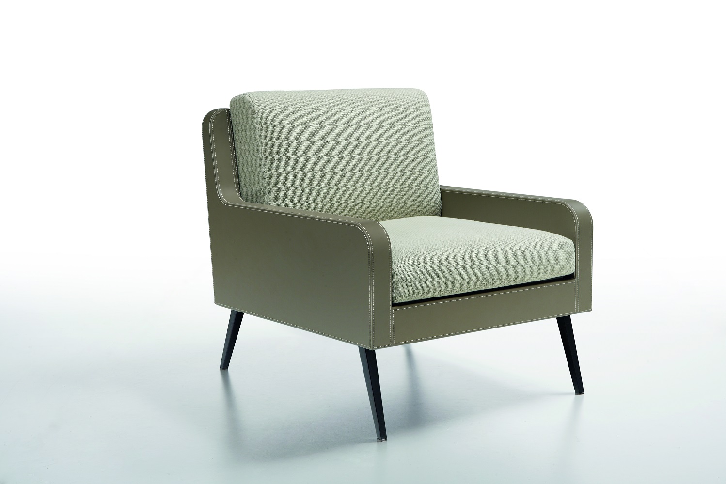 Armchair with four legs frame in chrome. Seat upholstered in leather, eco-leather, fabric or custom fabric. Available version with external side upholstered in hide.