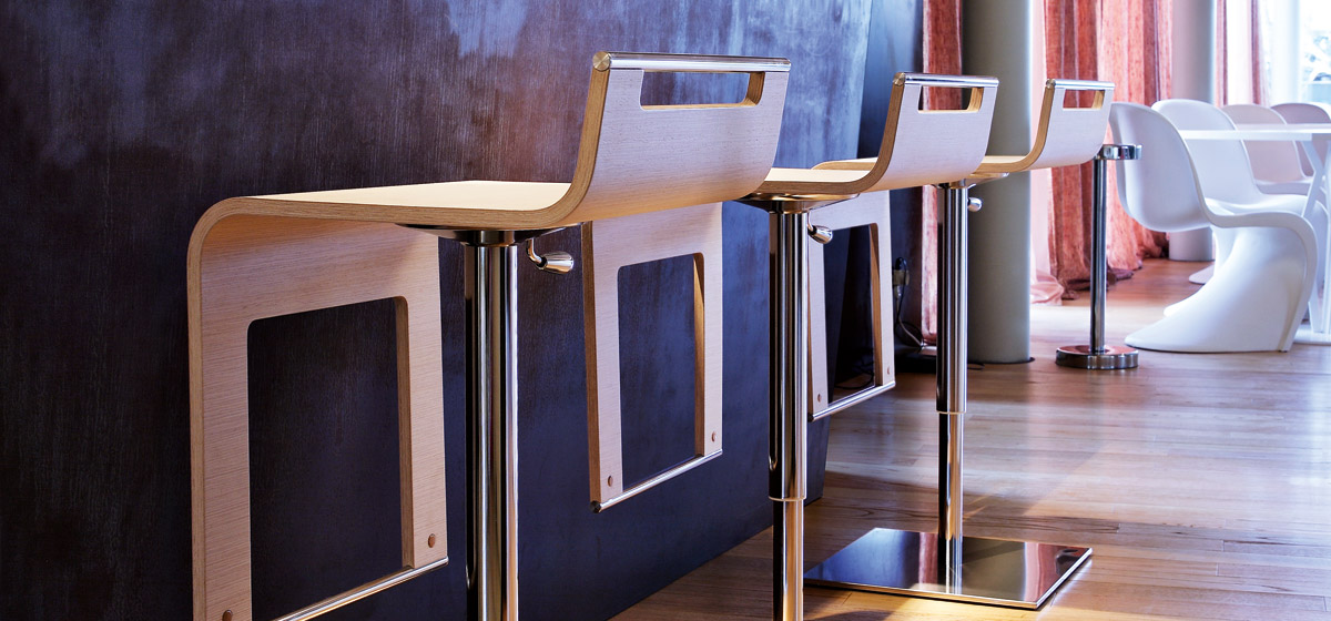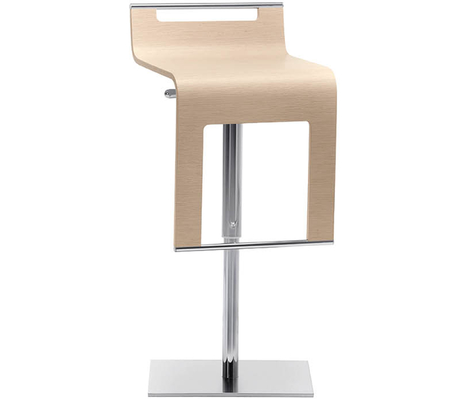 Swivel and height adjustable stool with square base in satin steel. Chrome frame, seat and backrest in wood finish, dark oak or light oak. Footrest integrated into seat. Height adjusts from 69cm to 94cm and Seat Height adjusts from 56-81 cm.