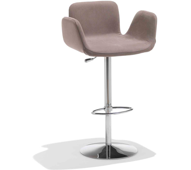 Swivel and height adjustable stool with round base and frame in chrome. Seat and backrest upholstered in leather, eco-leather, fabric or custom fabric. Chrome footrest. Height adjusts from 85cm to 110cm; Seat Height adjusts from 58cm to 83cm.