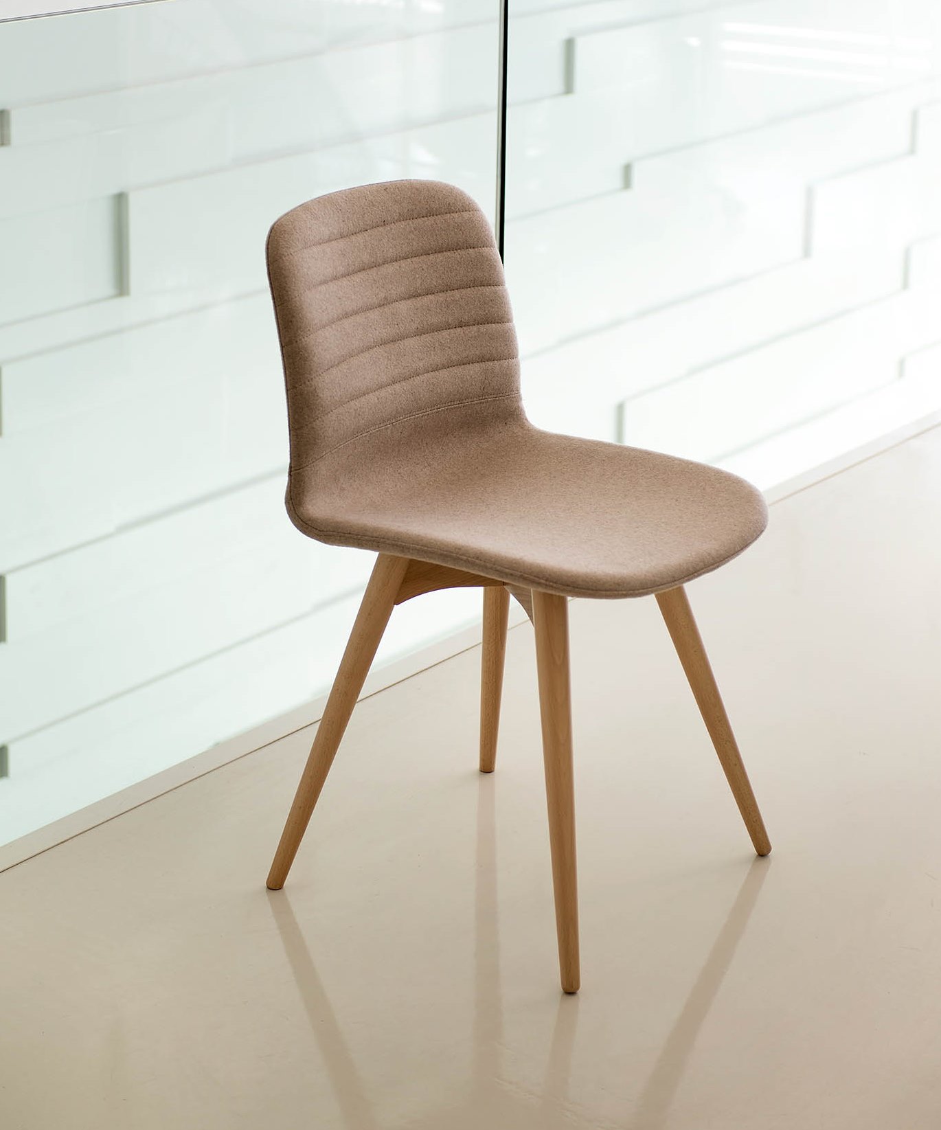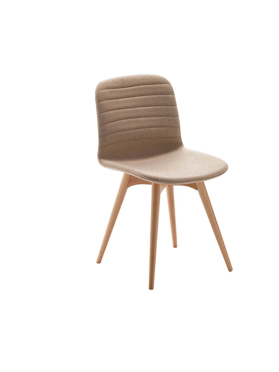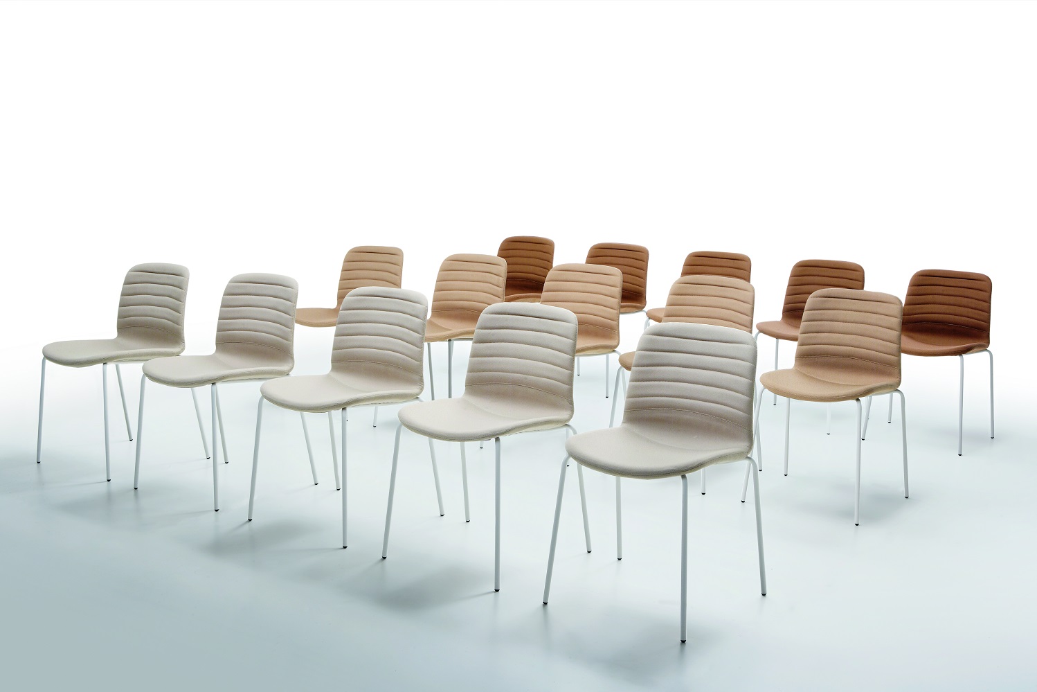 Fixed and 5-ways base chair and armchair, with wooden structure, painted or chrome steel. Shell in Restylon® or upholstered.