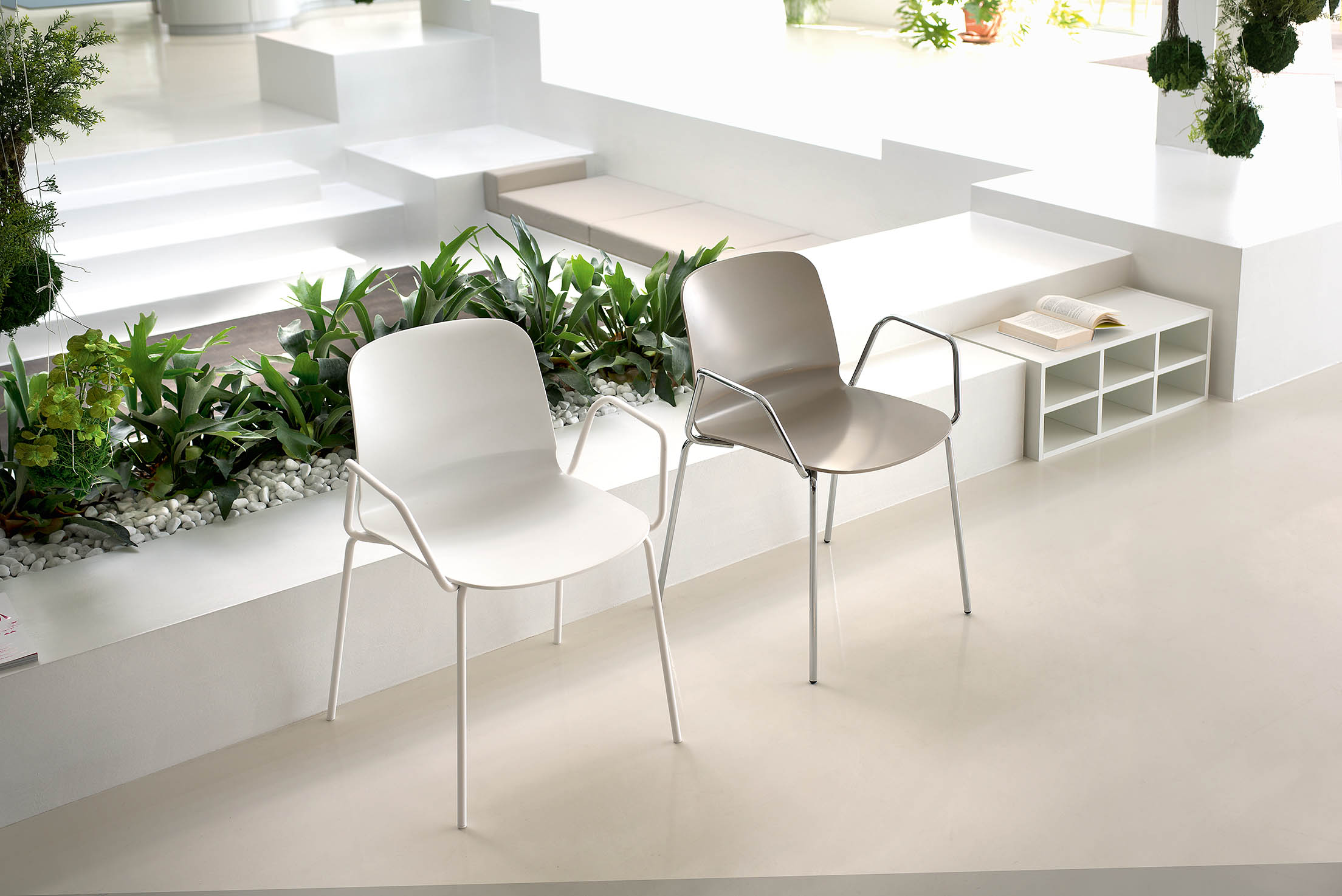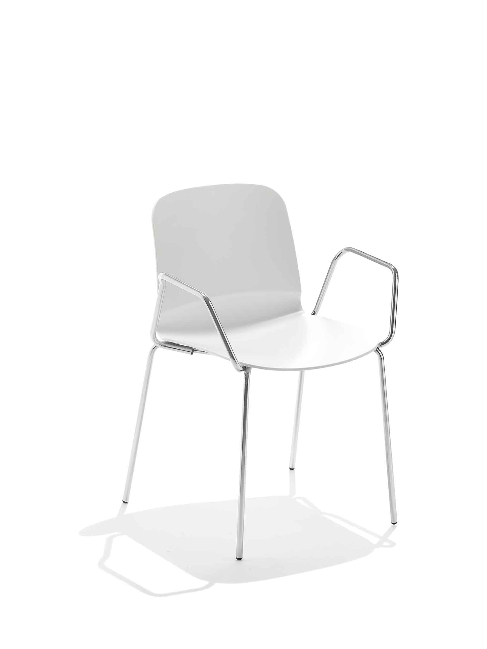 Armchair with four-leg frame in white, sand, aluminium painted or chrome. Shell in Restylon® or upholstered in leather, eco-leather, fabric or custom fabric. Restylon®/steel version suitable for outdoor use. Stackable up to four pieces.