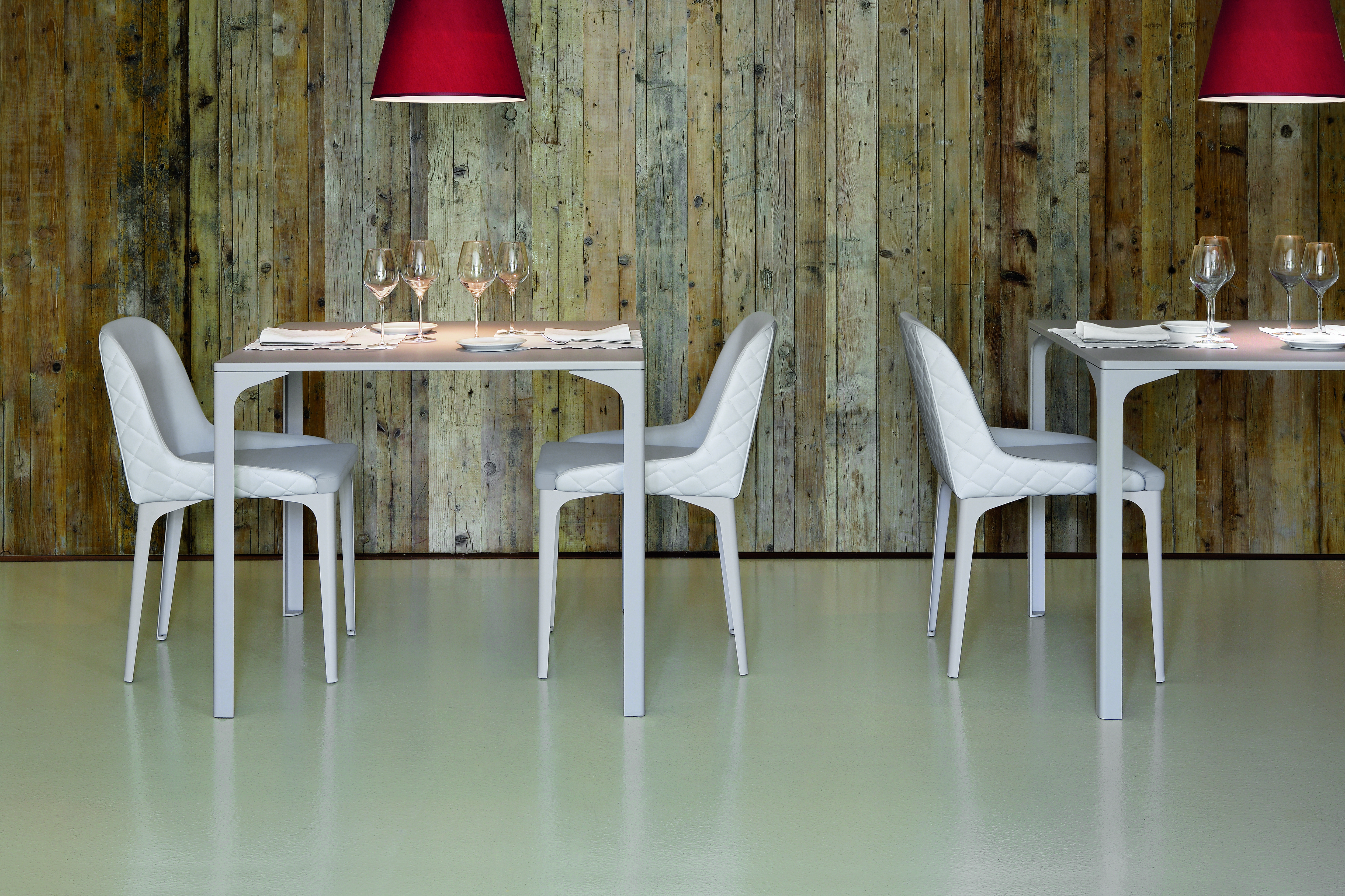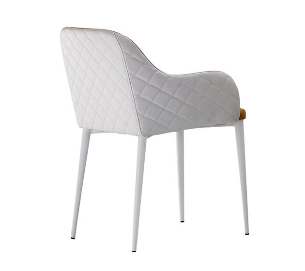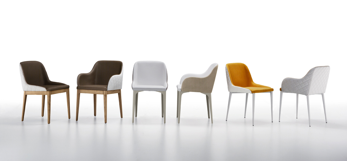 Armchair with four conical-leg frame in chrome or white painted steel. Seat upholstered in leather, eco-leather, fabric or custom fabric. The shell is available in plain colour, contrasted colours or with upholstery backrest in quilted eco-leather.