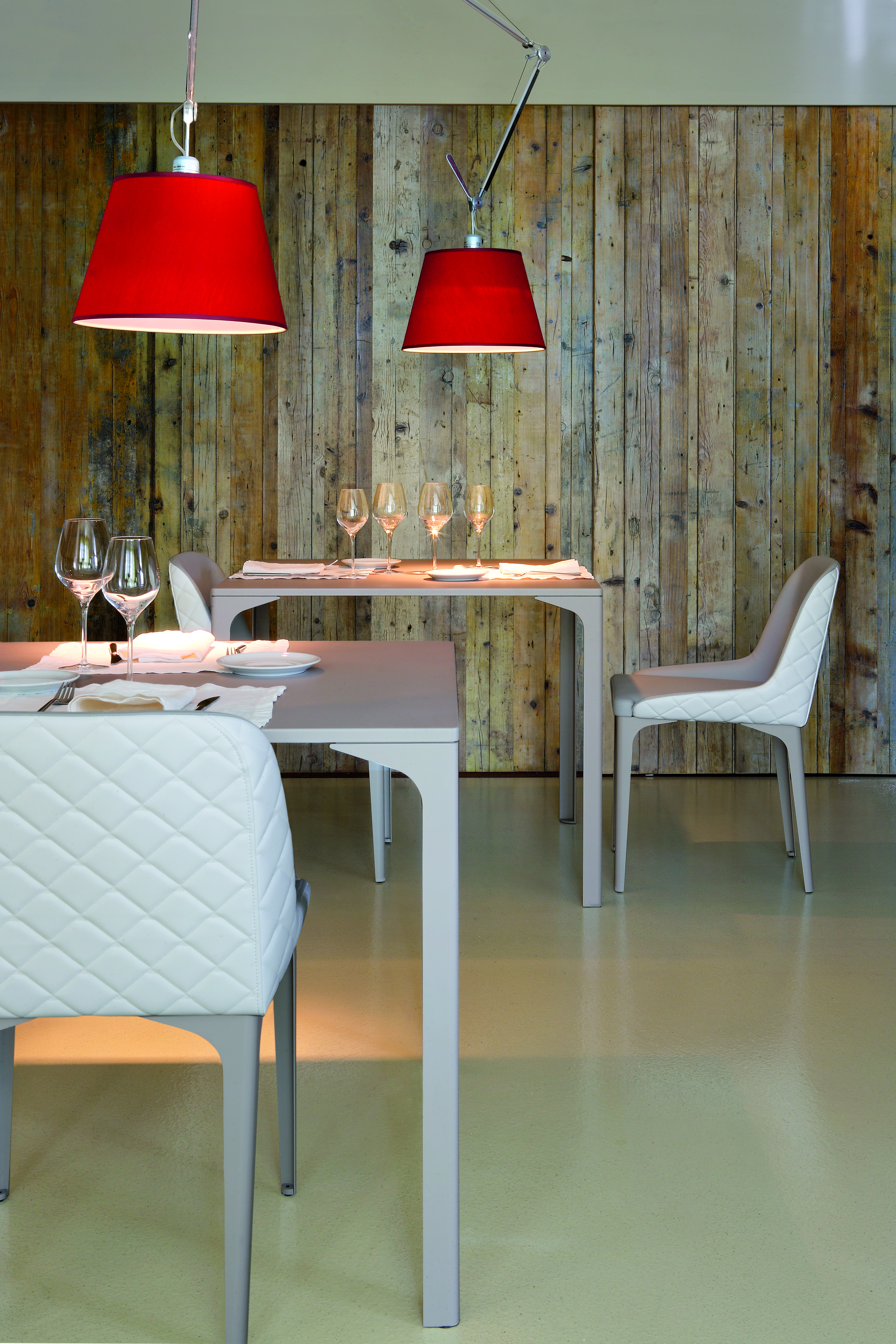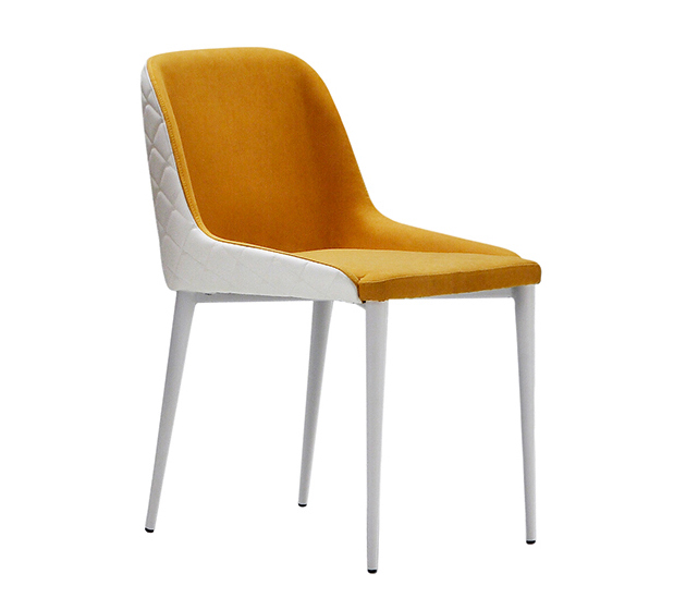 Chair with four conical-leg frame in chrome or white painted steel. Seat upholstered in leather, eco-leather, fabric or custom fabric. The shell is available in plain colour, contrasted colours or with upholstery backrest in quilted eco-leather.