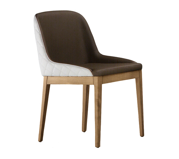 Chair with four-leg frame in wood finish dark oak, light oak, walnut or white lacquered. Seat upholstered in leather, eco-leather, fabric or custom fabric. The shell is available in plain colour, contrasted colours or with upholstery backrest in quilted eco-leather.