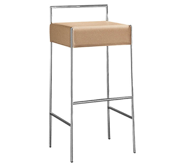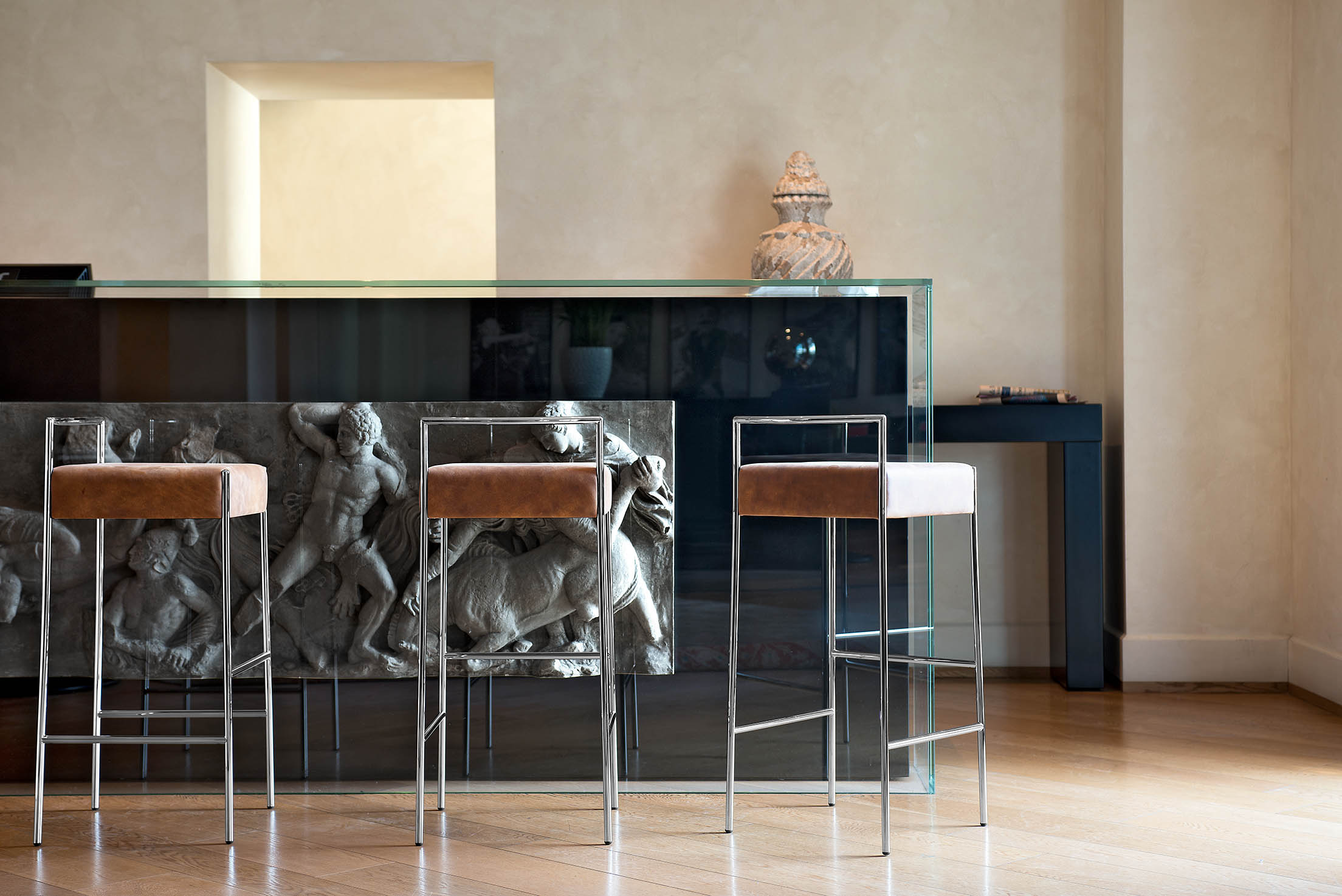 Barstool with four-leg frame in chrome. Upholstered seat in hide, regenerated hide, leather, eco-leather, fabric or custom fabric. H65-TS Height is 78cm and Seat Height is 66cm. H75-TS Height is 88cm and Seat Height is 76cm.