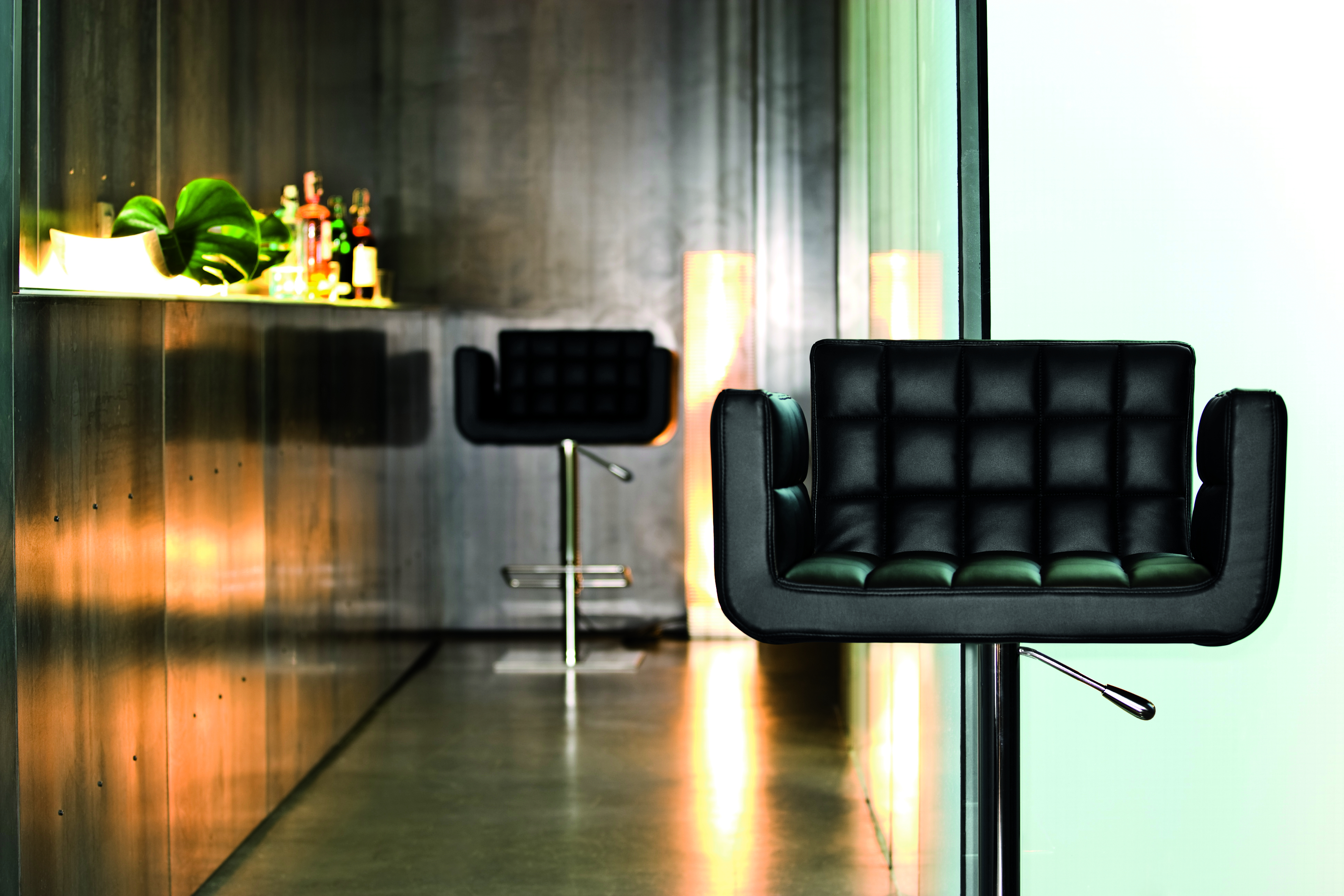 Swivel stool with chrome steel frame. Upholstered shell.