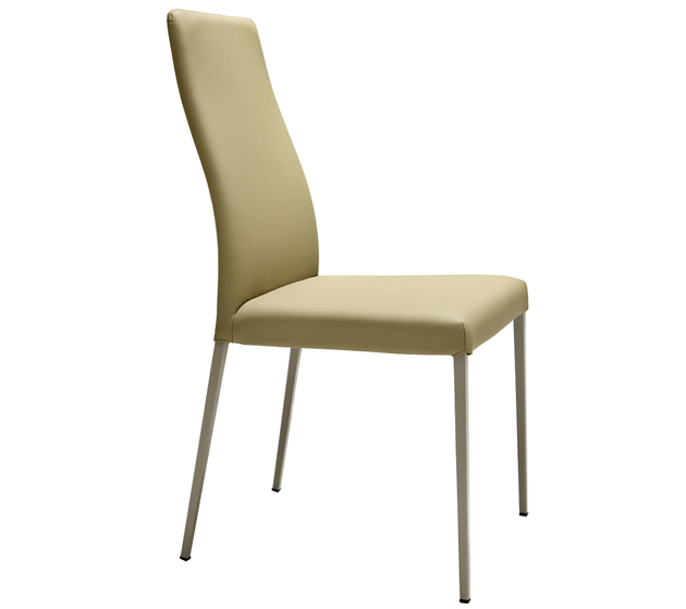 Chair with four-leg frame in chrome, white, aluminium or sand painted steel. Seat upholstered in hide, regenerated hide, leather, eco-leather, fabric or custom fabric. Available version with backrest in quilted eco-leather.