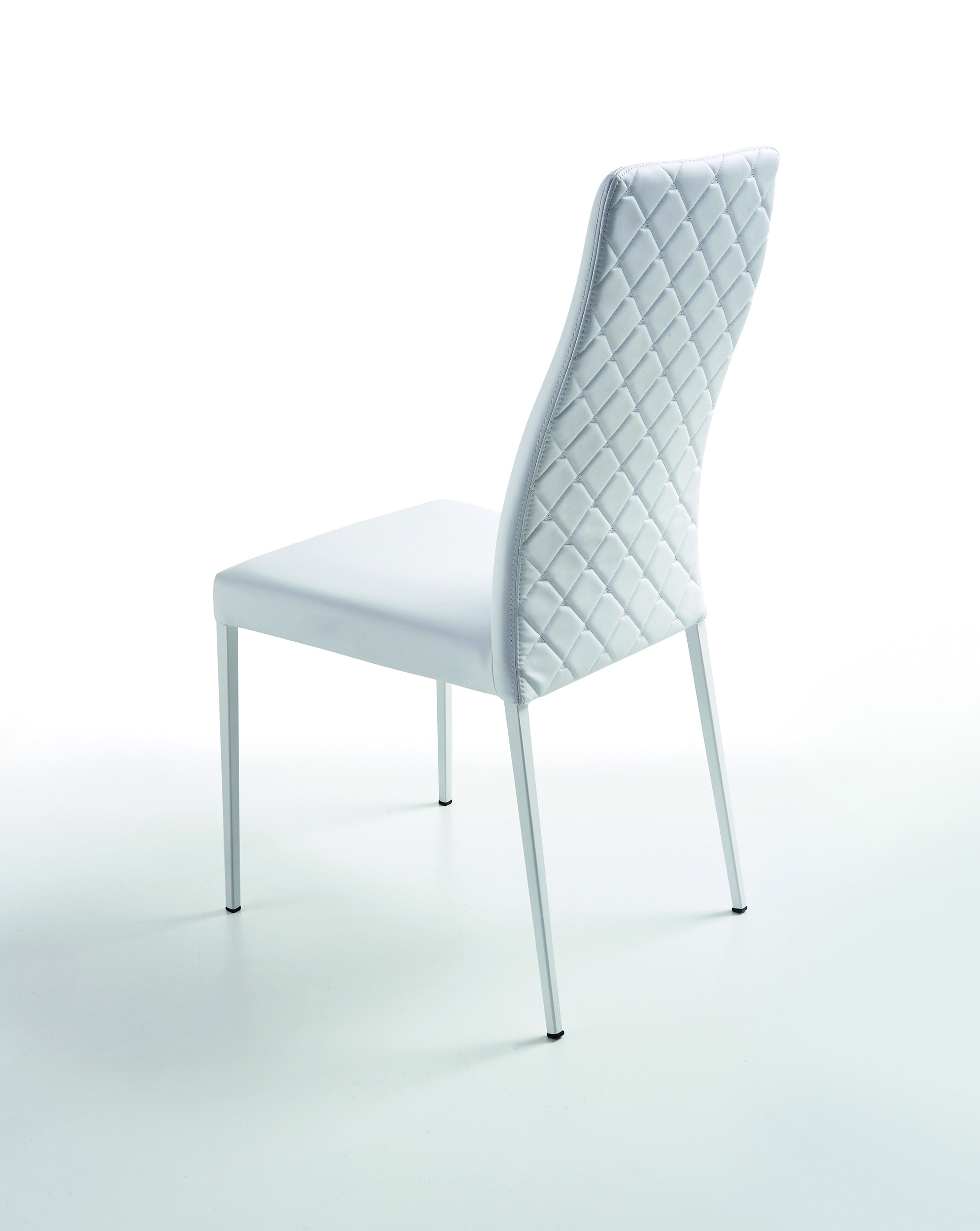 Chair with four-leg frame in chrome, white, aluminium or sand painted steel. Seat upholstered in hide, regenerated hide, leather, eco-leather, fabric or custom’s fabric. Available version with backrest in quilted eco-leather.
