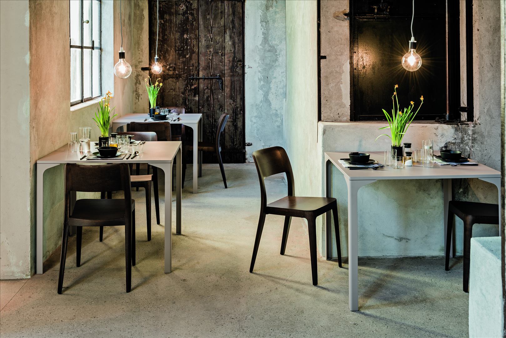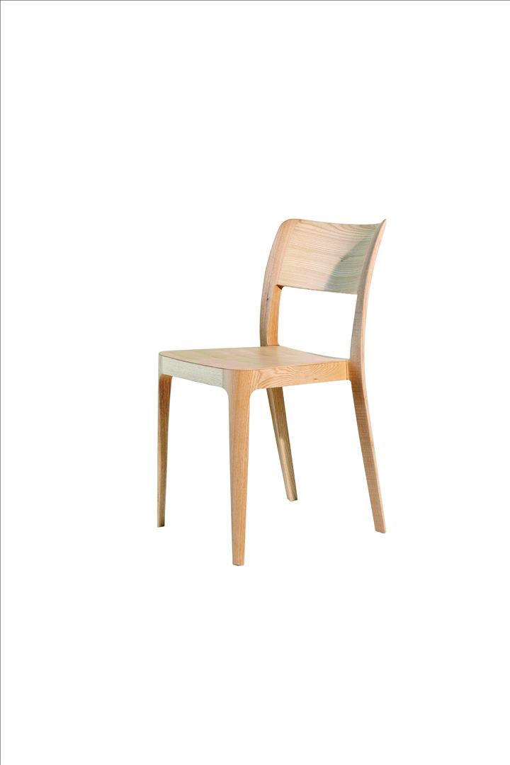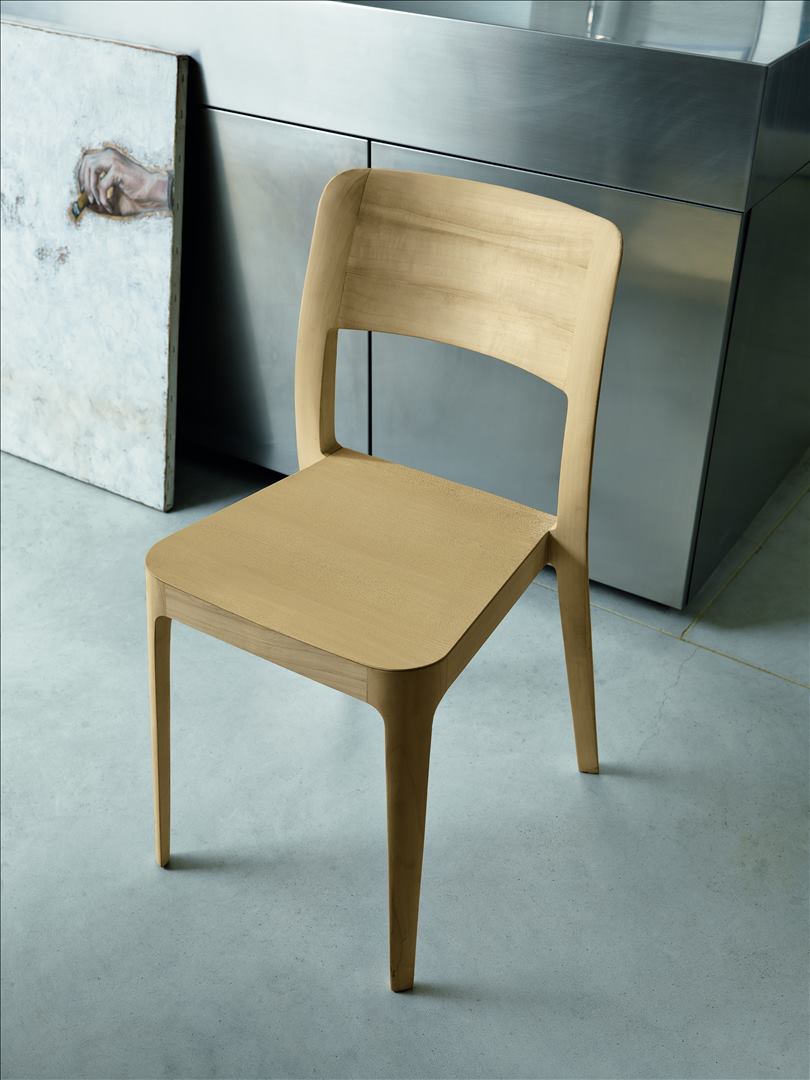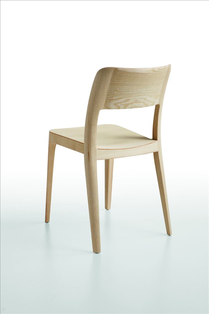 Stackable chair with four-leg frame in wood finish dark oak, light oak, walnut. Stackable up to four pieces.