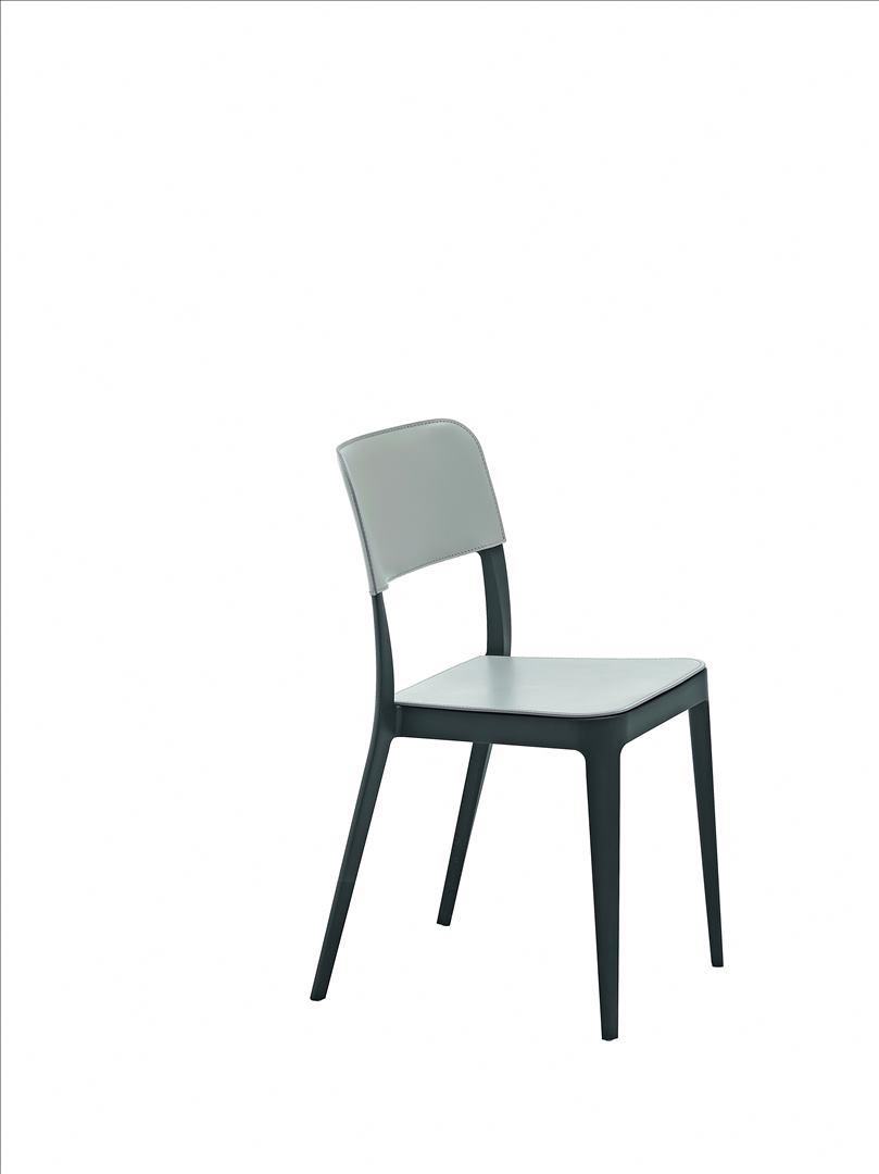 Chair with four-leg base in polypropylene, seat and backrest in hide or regenerated hide.