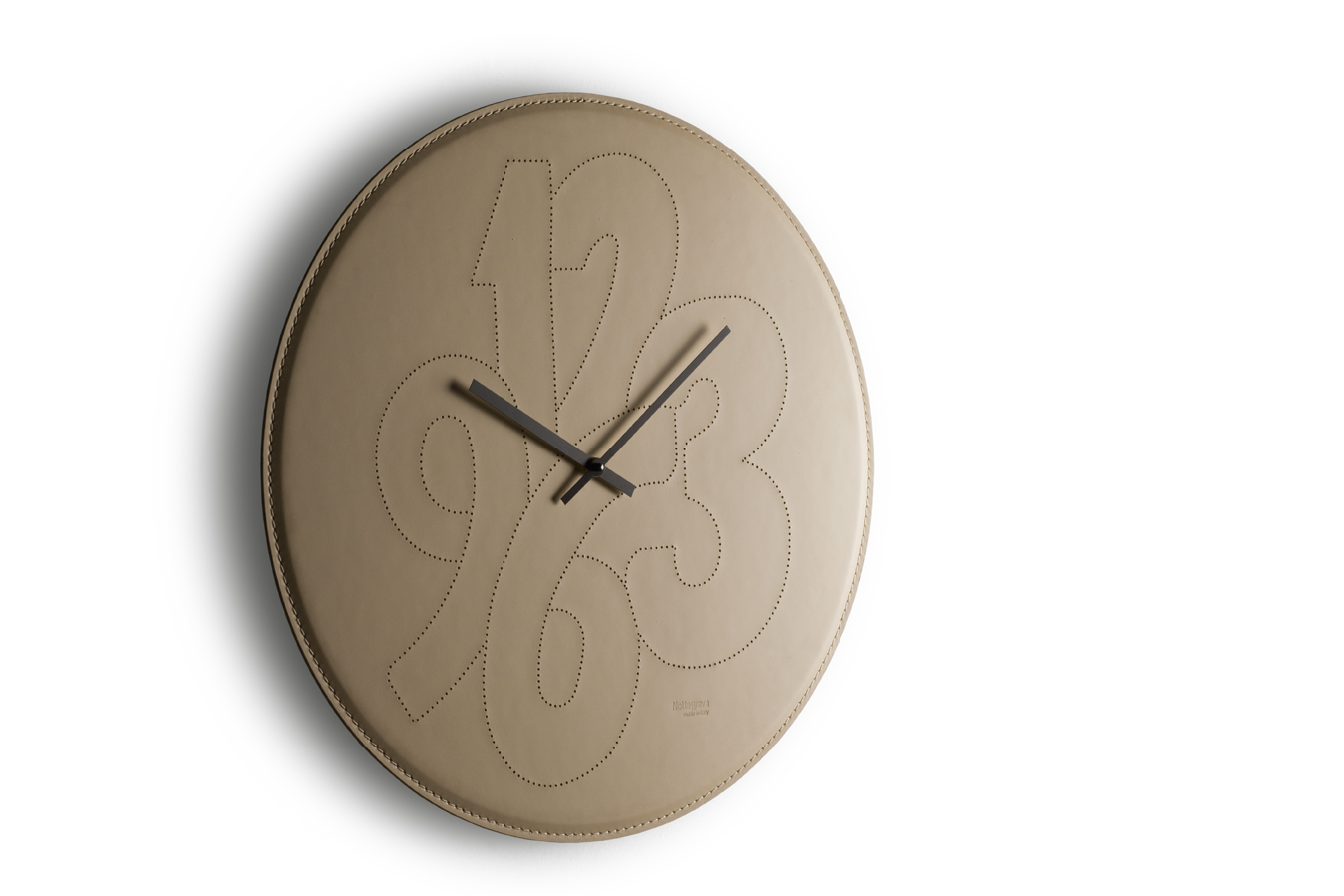 Clock in stitched regenerated leather.