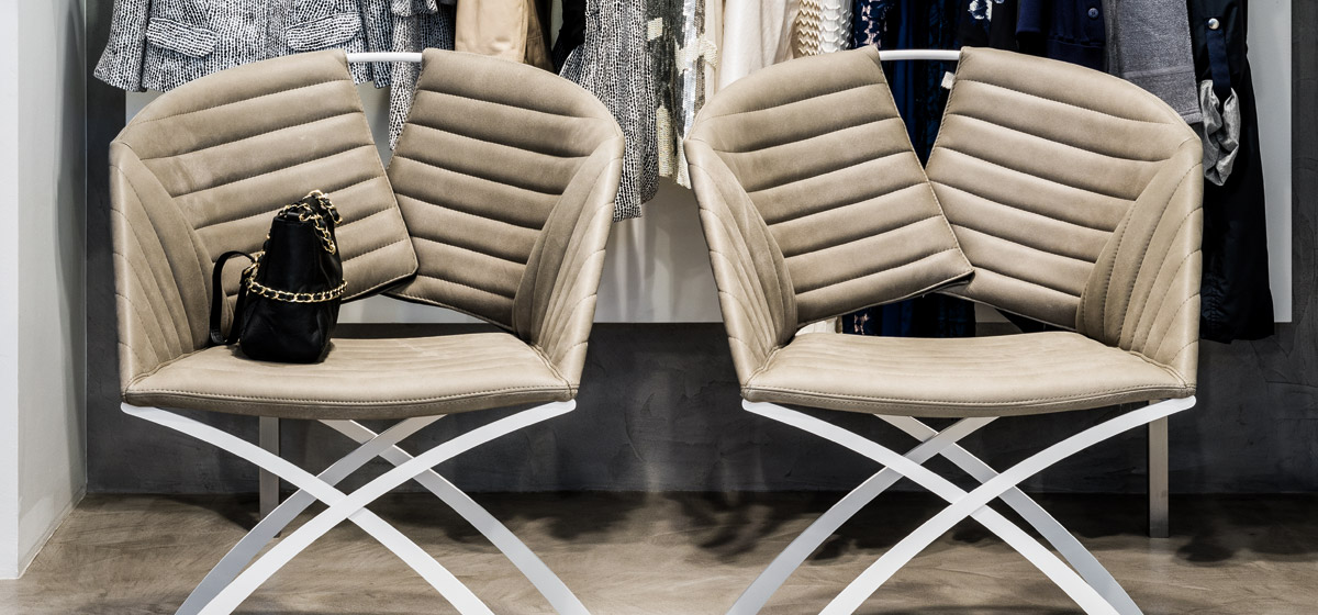 Seat and backrest upholstered in leather, eco-leather, fabric or custom fabric across a folded and quilted seat / backrest.
