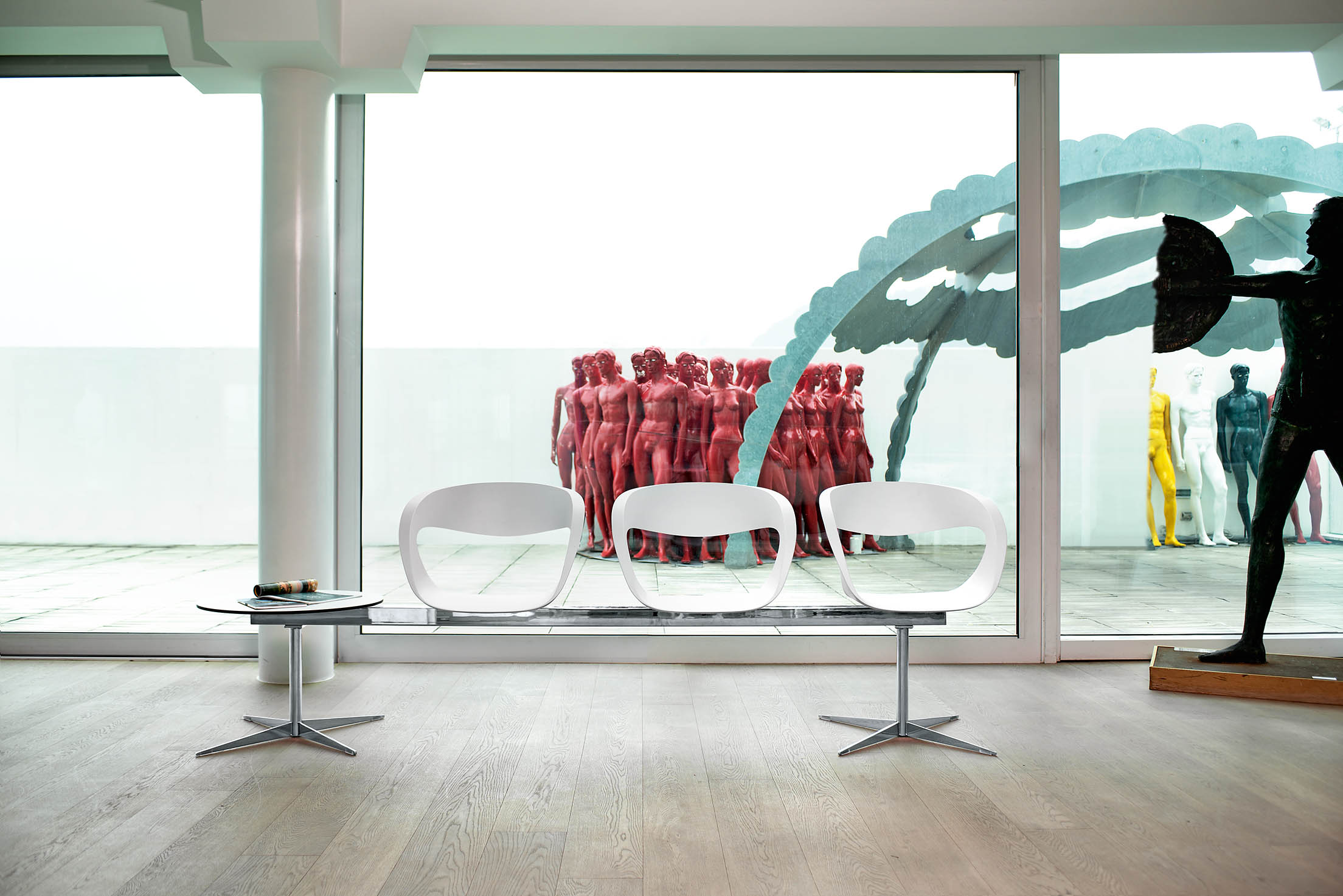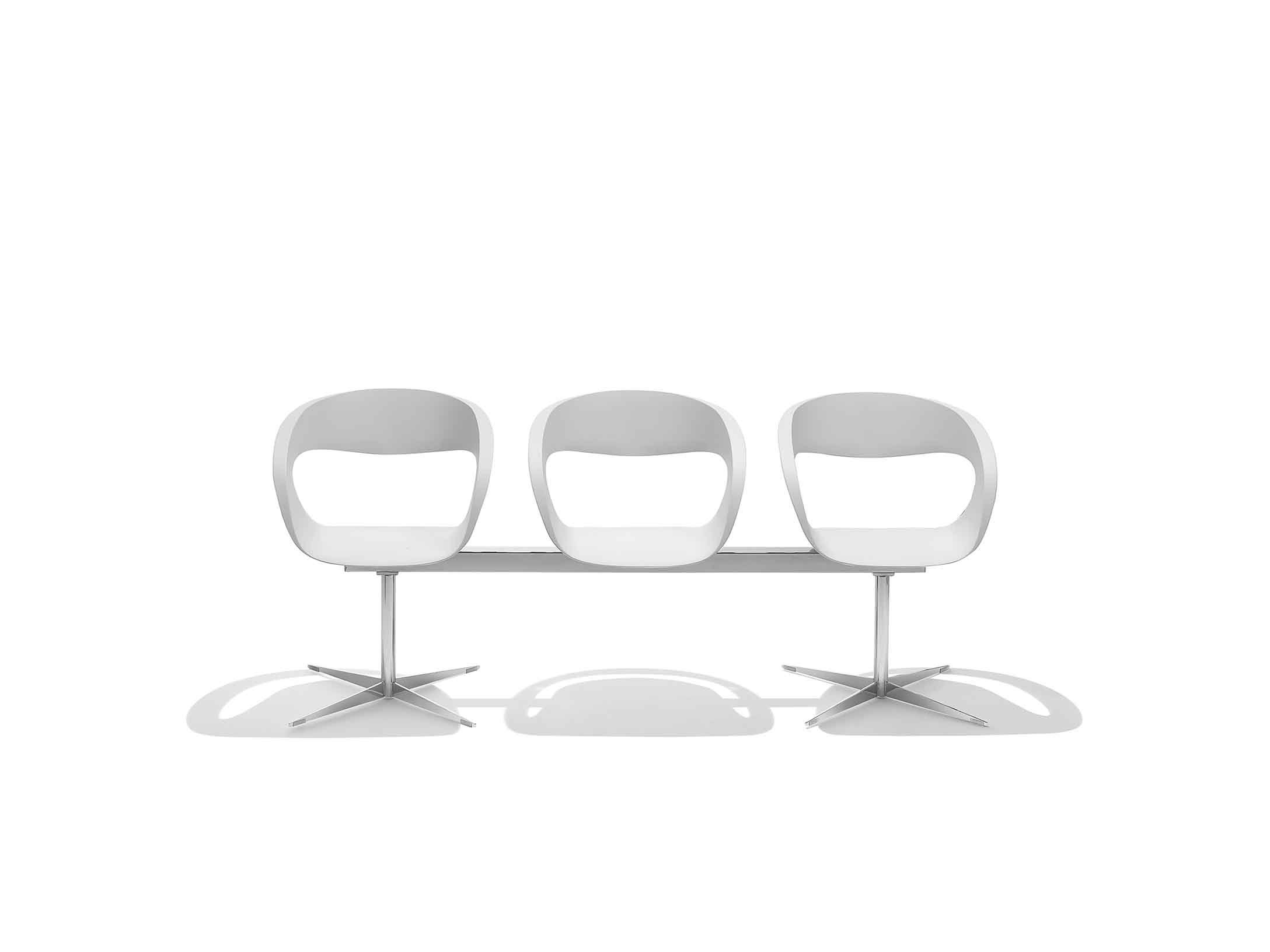 Three-seat bench available in chrome frame, seats available in Baydur® or upholstered in leather, eco-leather, fabric or custom fabric.