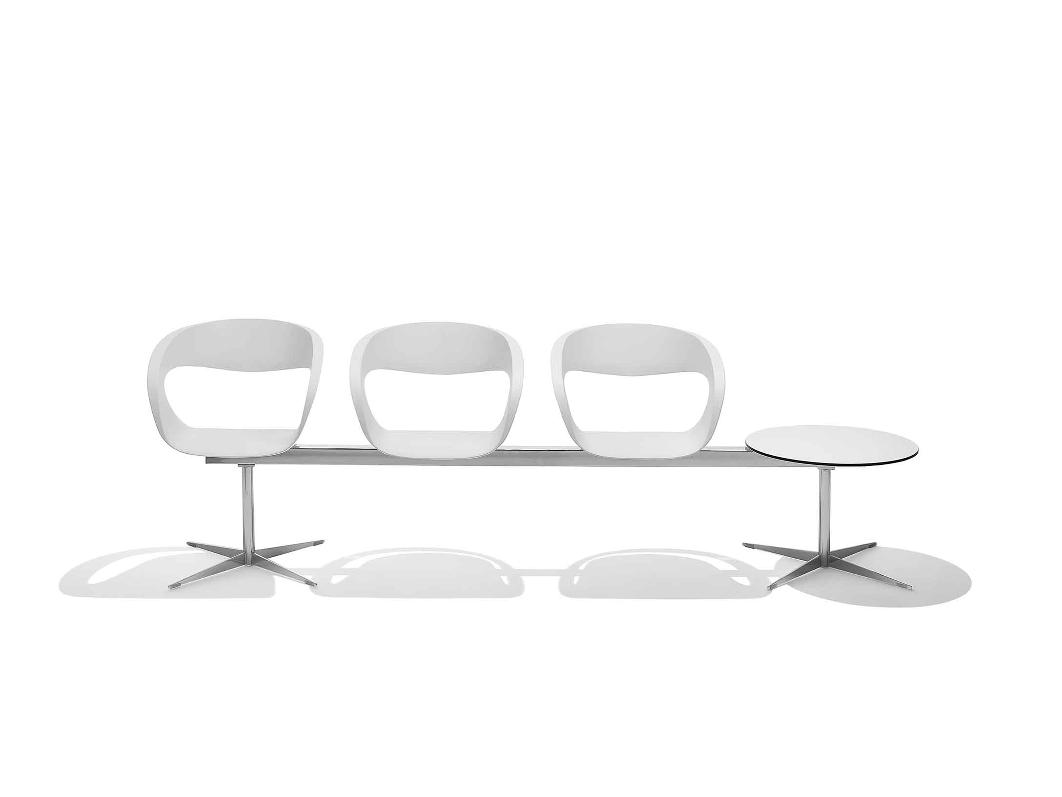 Three-seat bench with coffee table. Chrome frame, seats available in Baydur® or upholstered in leather, eco-leather, fabric or custom fabric. Coffee table top is available in solid laminate white or black.