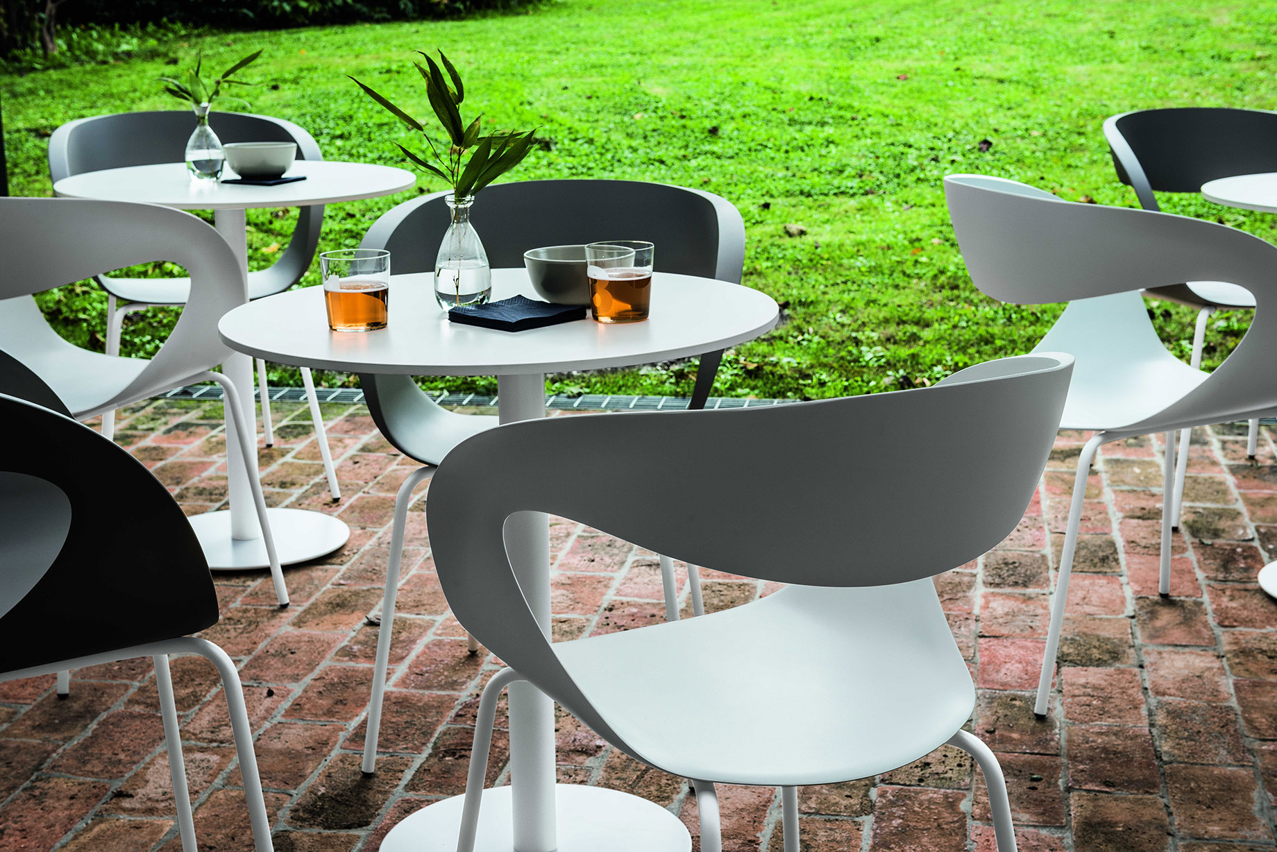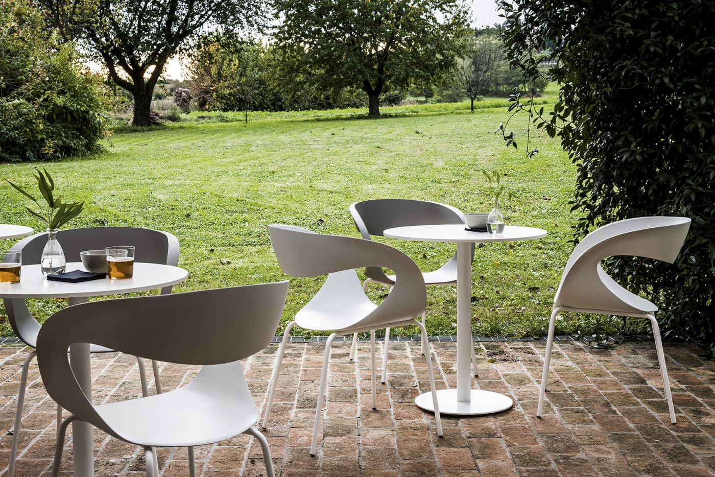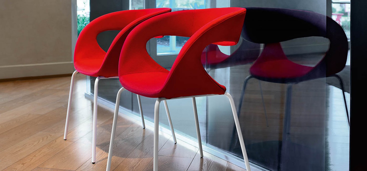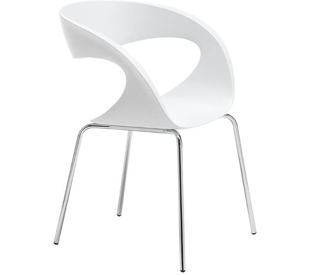 Tub chair with four-leg frame in chrome, white or ash grey painted. Shell available in six colours of Baydur® or upholstered with leather, eco-leather, fabric or custom fabric. The variation painted steel-Baydur® is suitable for outdoor use. Stackable up to 2 pieces.