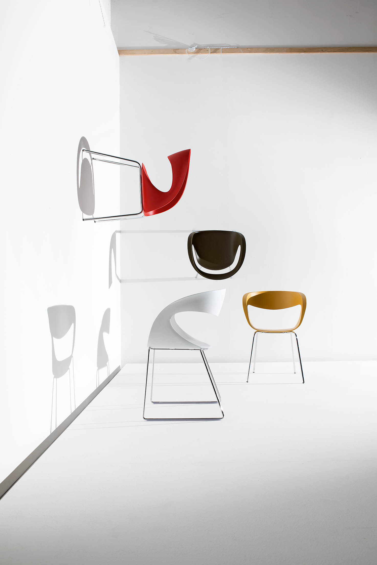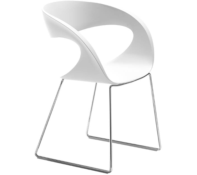 Chair with sled base in chrome, white or ash grey painted. Shell available in six colours of Baydur® or upholstered with leather, eco-leather, fabric or custom fabric. The variation painted steel-Baydur® is suitable for outdoor use.