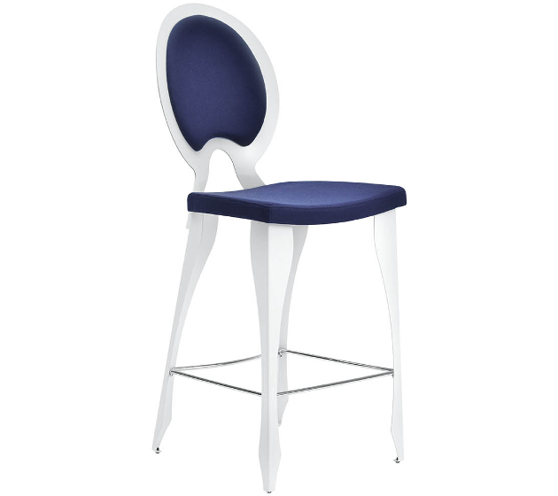 Medallion barstool with four-leg base in chrome or white painted. Seat upholstered in leather, eco-leather, fabric or custom fabric. Full backrest.