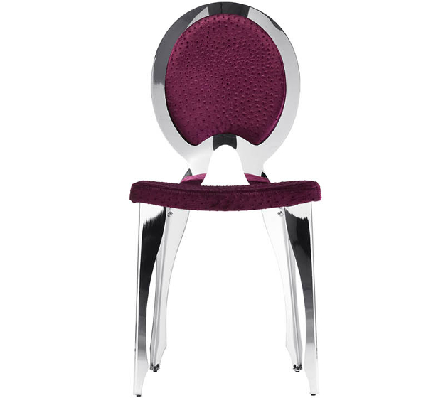 Medallion chair with four-leg base in white painted or chrome. Seat upholstered in leather, eco-leather, fabric or custom fabric. Full backrest.