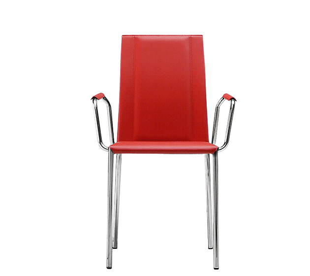 Chair with armrests. Four-leg frame in chrome, white or aluminium painted. Seat upholstered in leather, eco-leather, fabric or custom fabric. Armrests in chrome with upholstery same as seat. Stackable up to four pieces.
