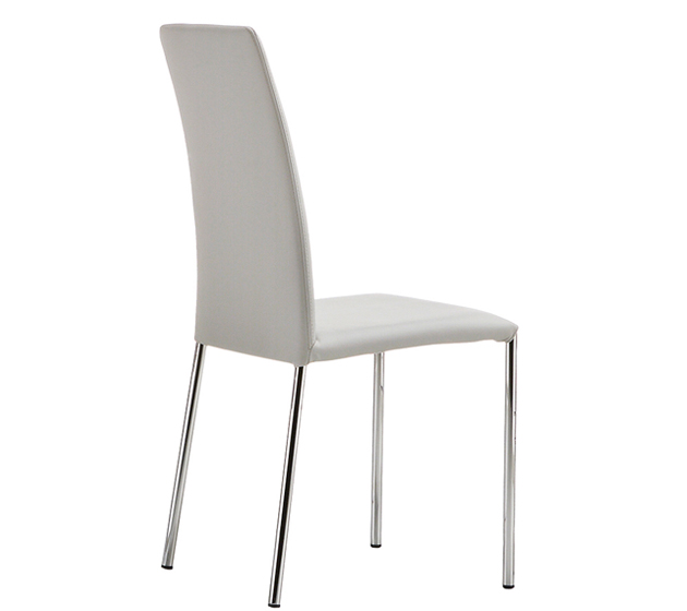 Chair with four leg base in chrome, white or aluminium painted. Seat upholstered in leather, eco-leather, fabric or custom’s fabric.