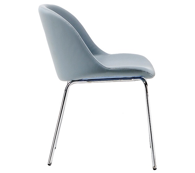 Armchair with four leg frame in chrome or white painted steel. Seat upholstered in leather, eco-leather, fabric or custom fabric. Available with back shell in quilted eco-leather.