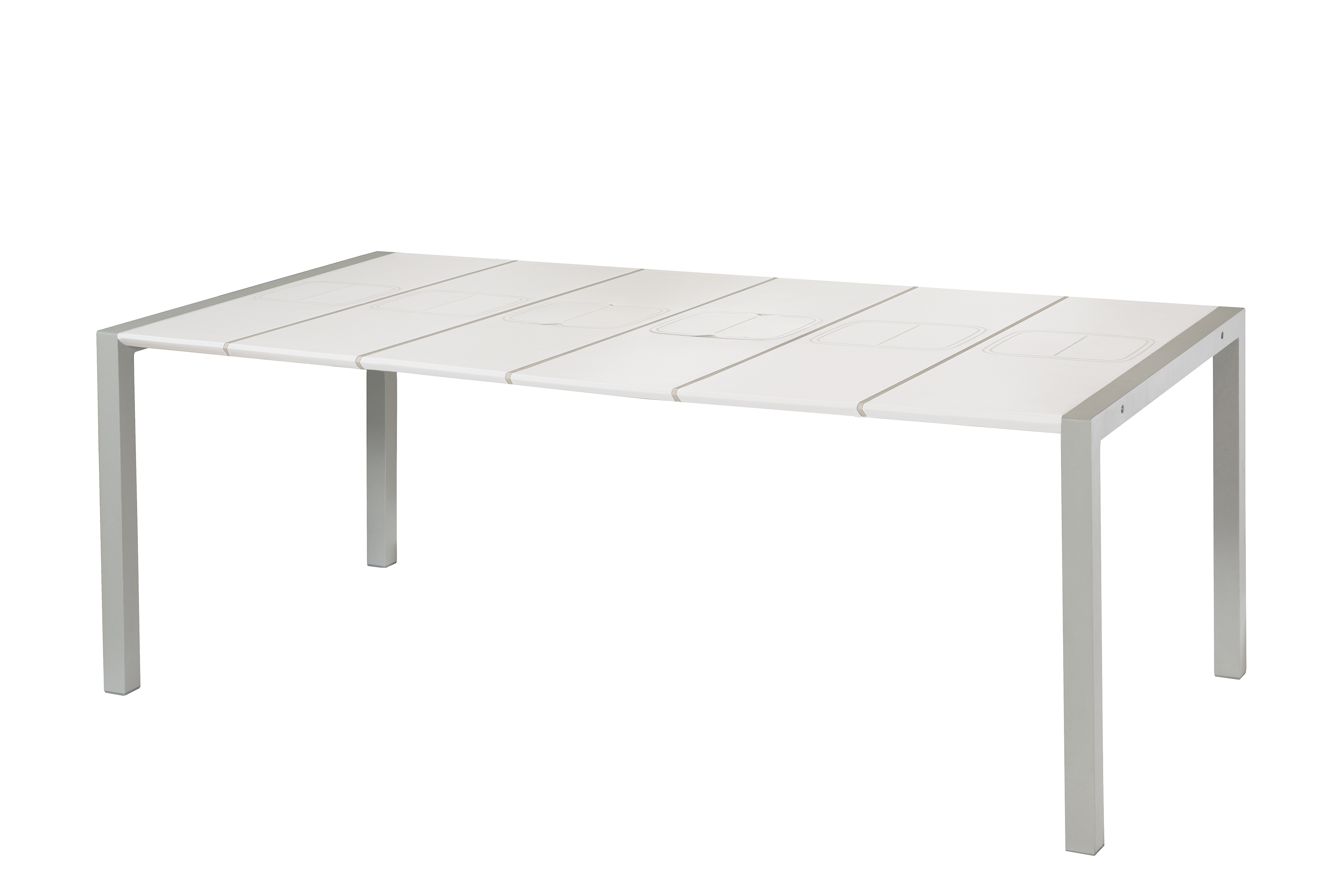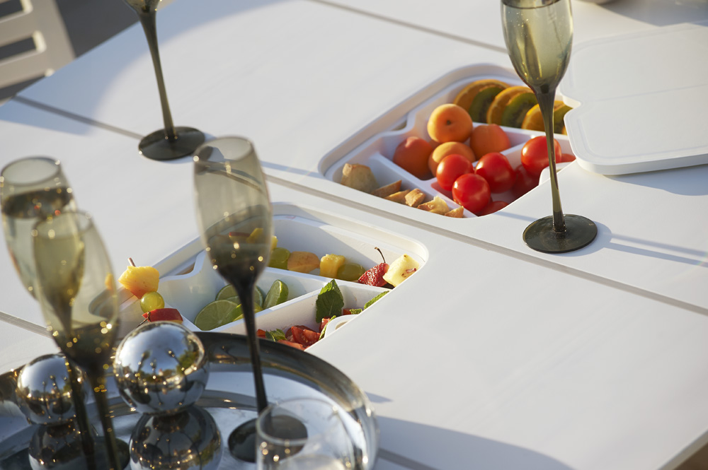 Designed for usability, the SUNDAY table offers elegant aluminium feet which allow a maximum of room for legs and an appetiser tray housed in the heart of table to start off the meal.