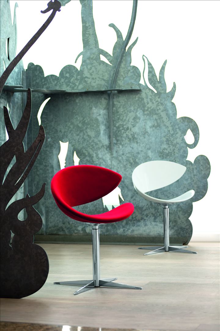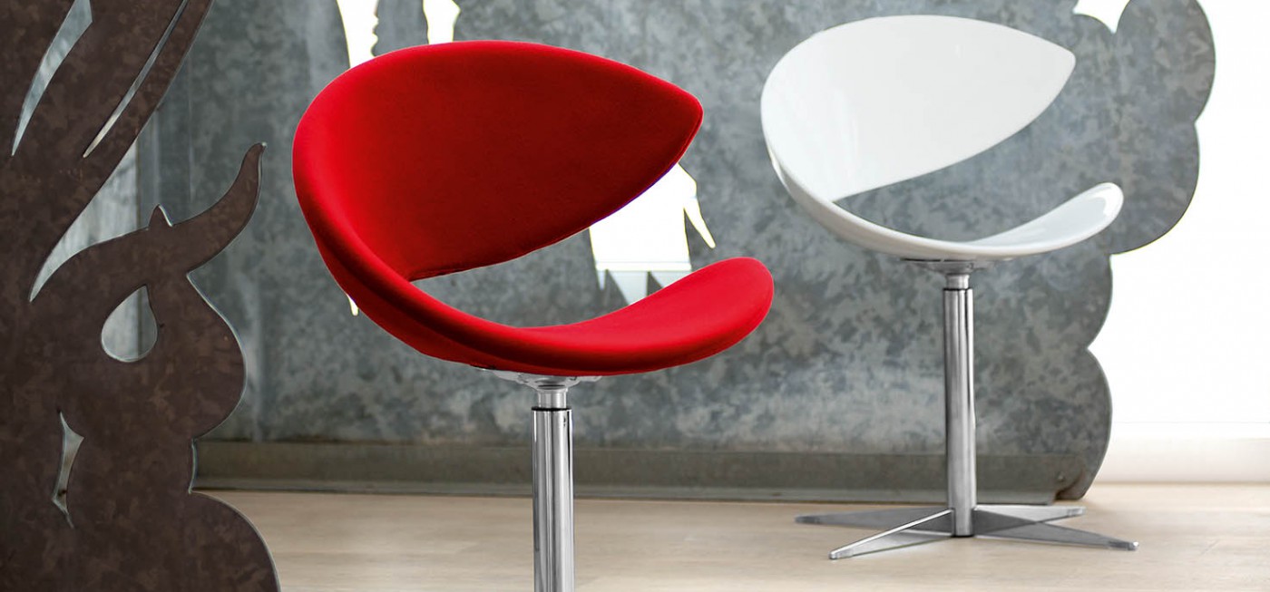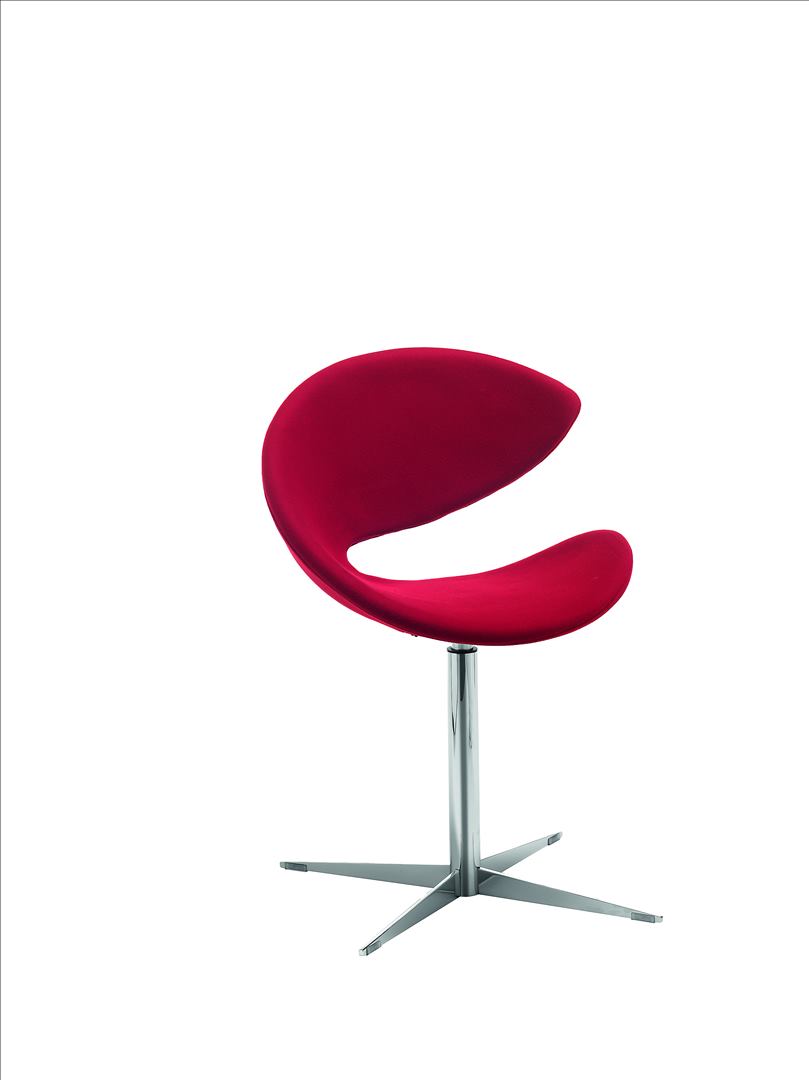 Swivel chair with four-way base in chrome. Shell available in four colours or Hirek® or upholstered in leather, eco-leather, fabric or custom fabric.