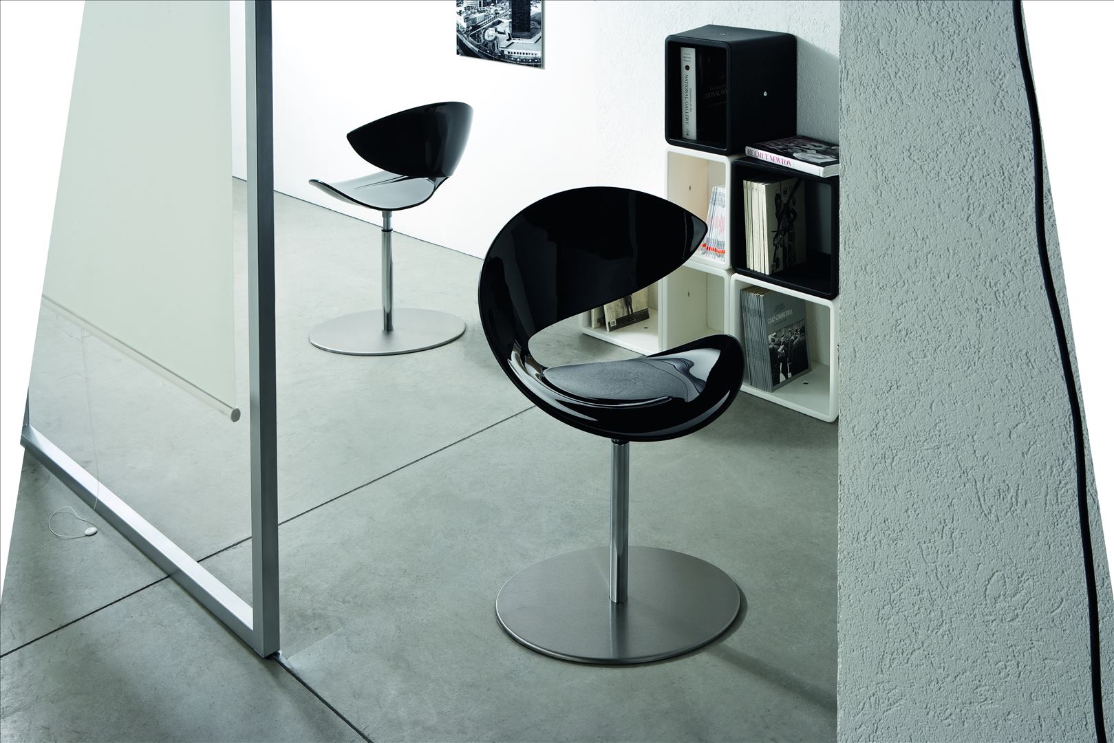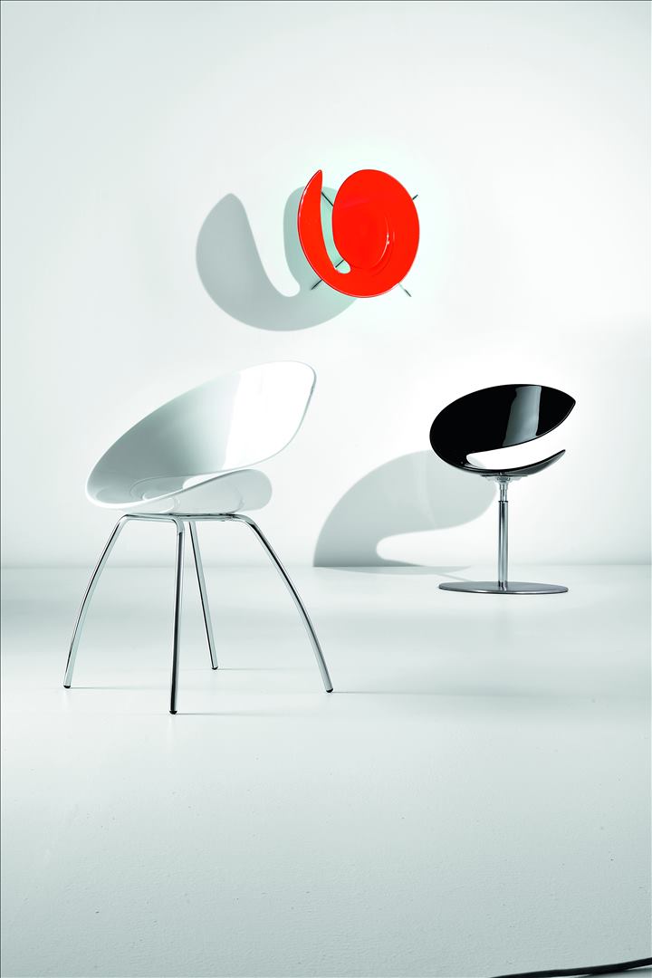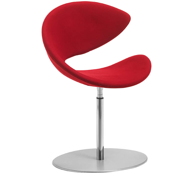 Swivel chair with round base in satin stainless steel and chrome structure. Shell available in four colours of Hirek® or upholstered in leather, eco-leather, fabric or custom fabric.