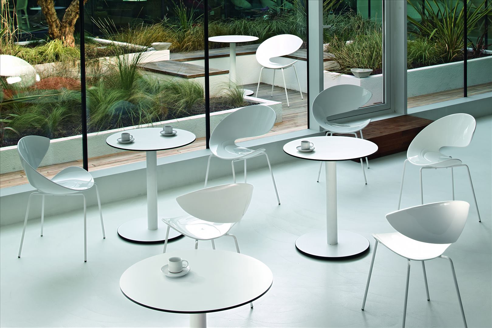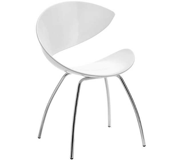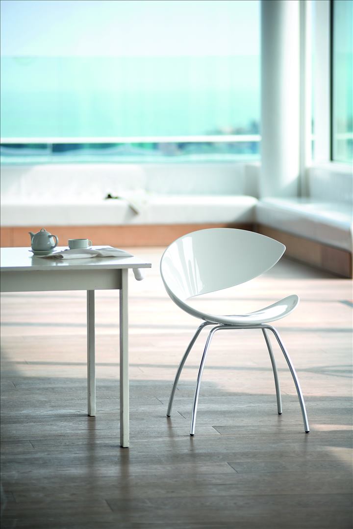 Chair with four-leg base in chrome, white or aluminium painted. Shell available in four colours of Hirek® or upholstered in leather, eco-leather, fabric or custos fabric. The chair with Hirek® shell is suitable for outdoor use.