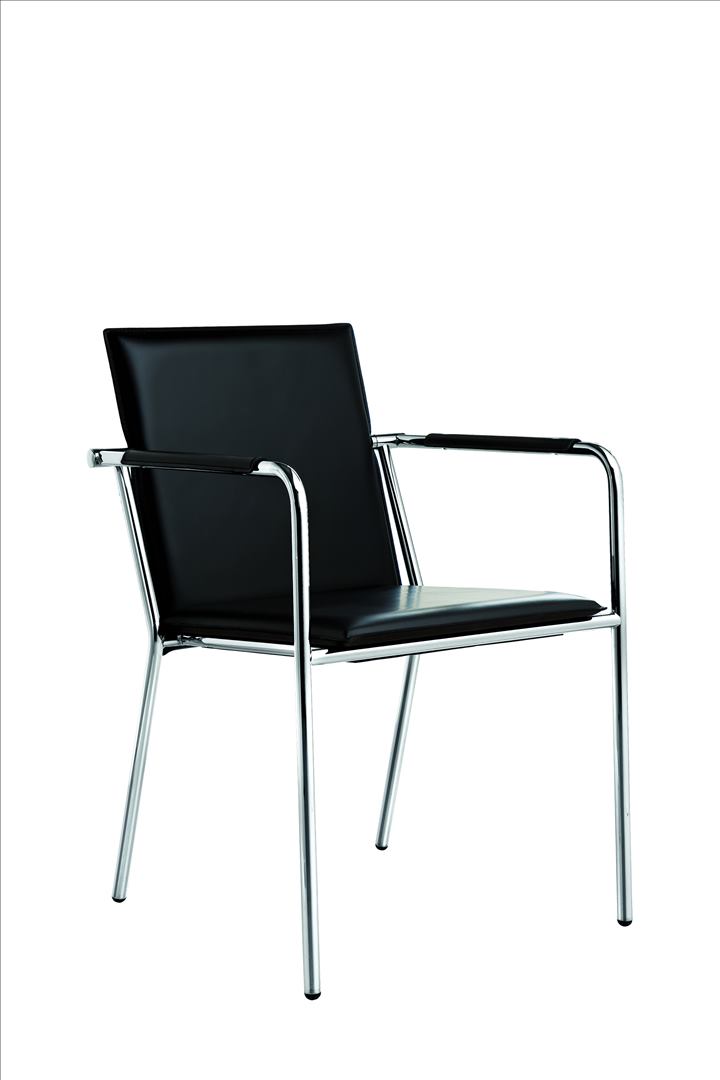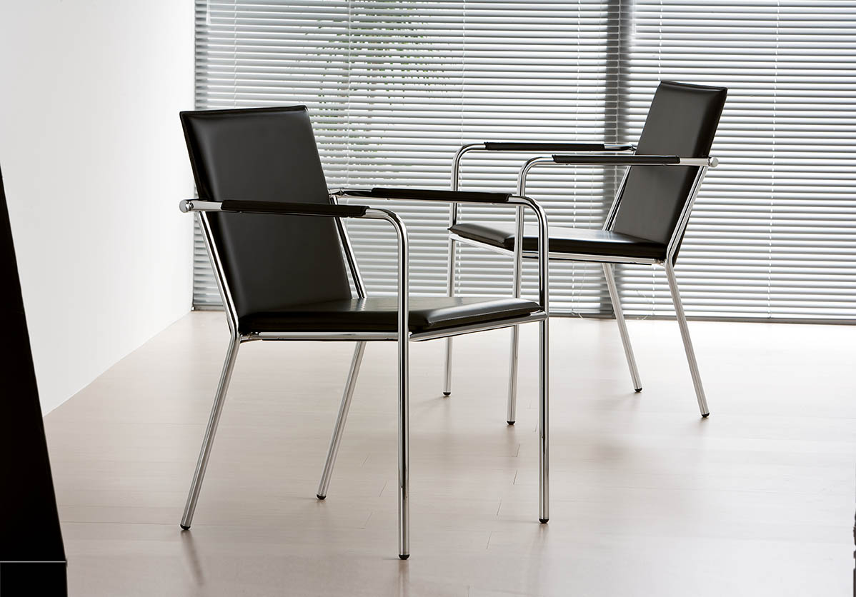 Stackable up to four pieces, chair with armrests and four-leg frame. Shell upholstered in hide, regenerated hide, leather, eco-leather, fabric or custom fabric.