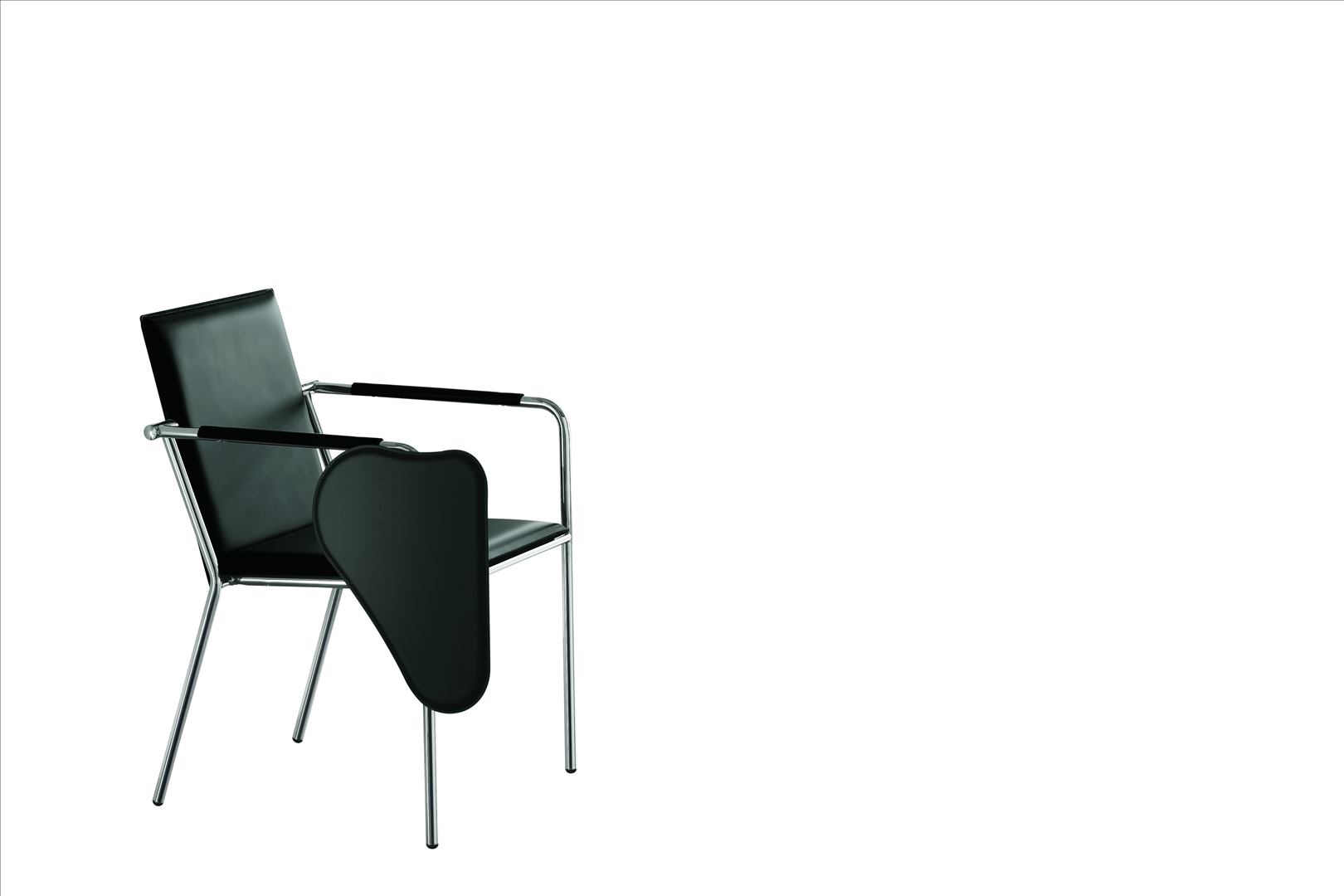Lecture chair with table, armrests and four-leg frame. Shell upholstered in hide, regenerated hide, leather, eco-leather, fabric or custom fabric.
